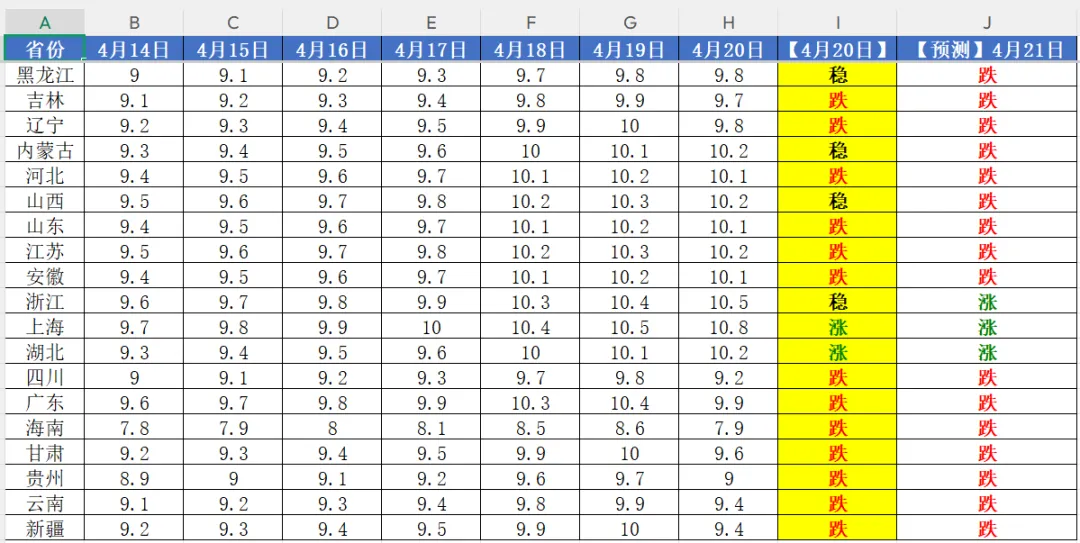 较昨日微跌 0.05 元 / 公斤涨跌分布:5 省上涨、17 省下跌、4 省持稳