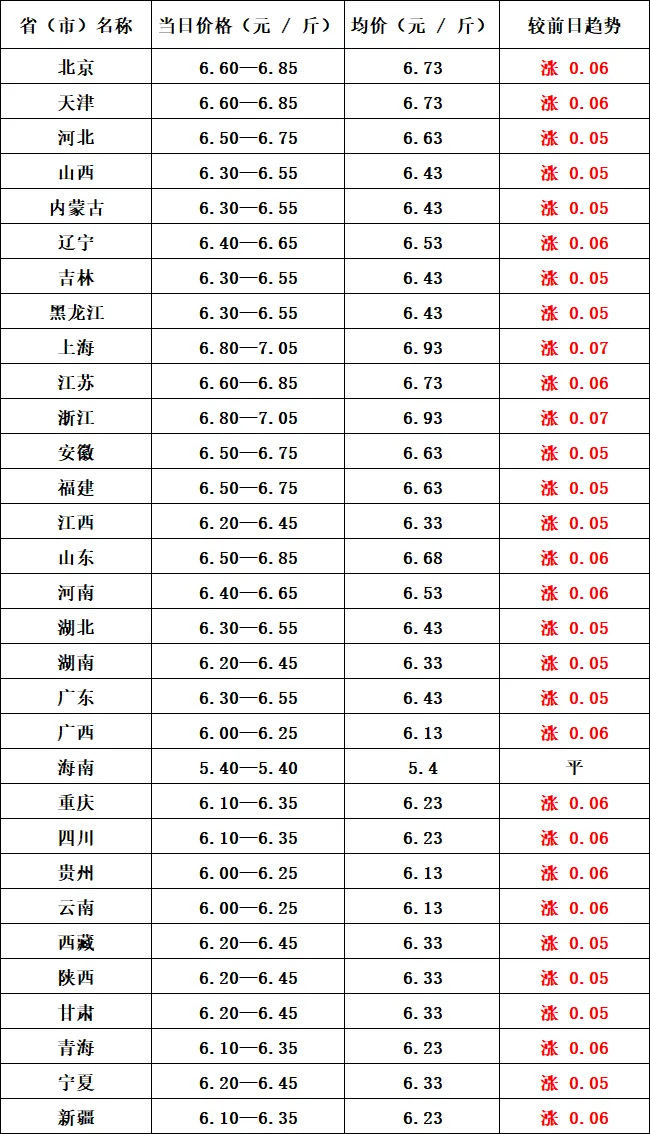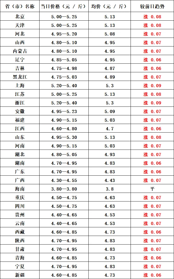 ? ? 今日猪价延续温和反弹态势,呈现“全域微涨、区域分化”的特征,全国仅海南维持价格持平,其余各省毛猪与白条猪肉价格同步小幅攀升,涨幅集中在0.05-0.09元/斤,整体走势贴合4月下旬生猪市场低位修复的预判,也为《猪价搜索》会员企业提供了清晰的市场参考。今日猪价的上涨并非趋势性反转,而是短期供需边际改善、市场情绪修复及政策预期共同作用的阶段性行情,核心逻辑与前日行情形成明显区分。
