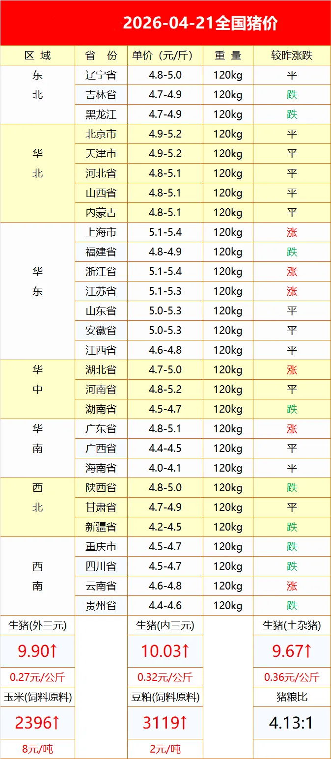 山东慧丰源4月21日猪价行情 养羊网 2026-04-21 山东慧丰源4月21日猪价行情 养羊网 2026-04-21 上一篇:2026年4月21日重庆鸡蛋收购参考价格 下一篇:2026年4月21日最新鸡蛋价格 您可能还会对下面的文章感兴趣111: 相关文章 近期价格更新!!! 近期价格更新!!! 2025年4月13日全国各地生猪价格信息 近期价格更新!!!