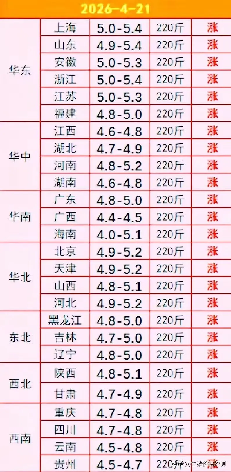 步入4月下旬,生猪价格涨势如虹,连日来“满堂红”的行情不断延续。据最新市场动态,4月21日全国猪价延续回暖趋势,华东、华南等多地猪价顺利挺进“五元区”,部分地区价格更是一路高歌猛进,距离突破6元关口仅一步之遥。此次猪价触底反弹力度远超市场预期,且涨势连贯、势头迅猛,在消费需求阶段性回暖的带动下,生猪价格被不断推向新高度,让长期承压的养猪户喜出望外,可谓“从梦中笑醒”。对于此前深陷亏损、经营艰难的各大养猪企业而言,这轮持续上涨无疑是“救命”般的利好,成功为整个养猪业缓解了生存压力,带来了脱困转机。