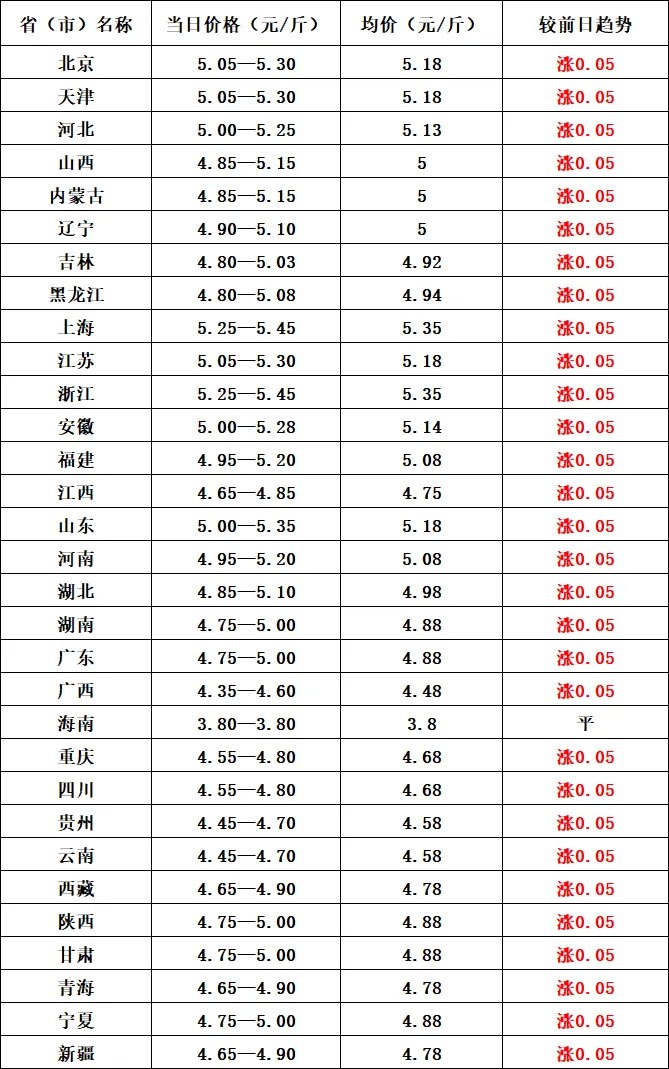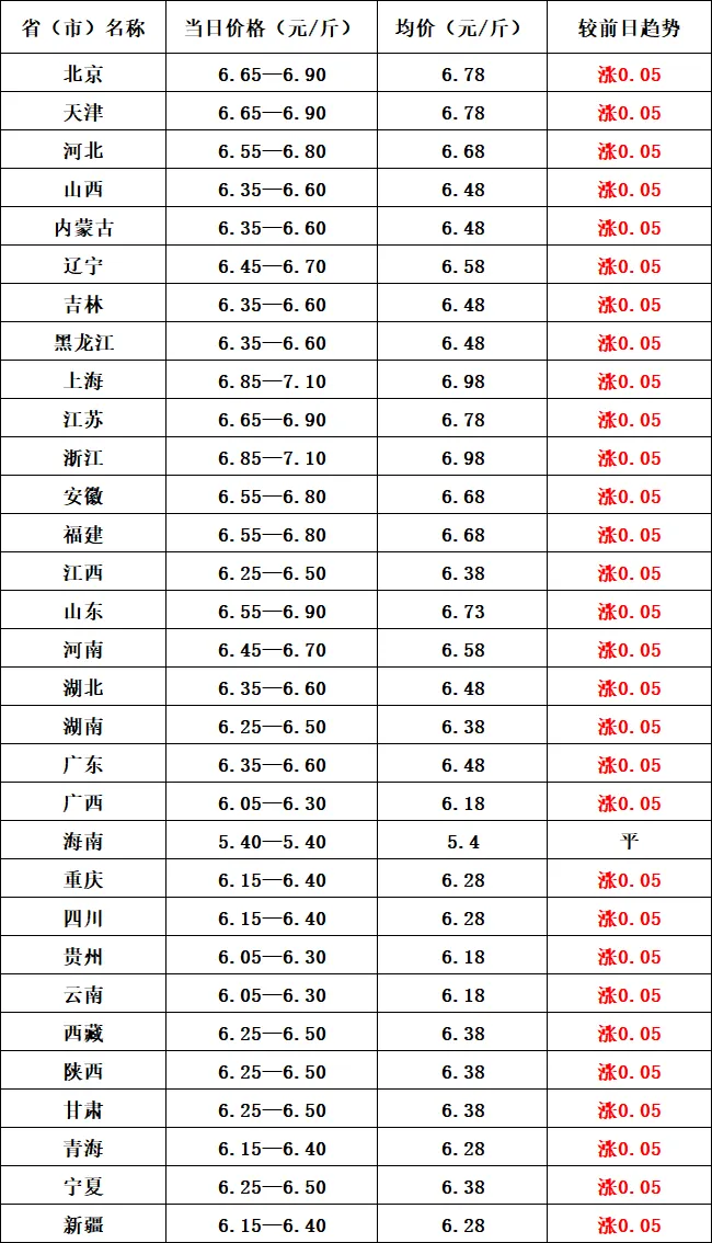 ? ? ?明日猪价将延续近期温和反弹态势,全国仅海南维持价格持平,其余各省毛猪与白条猪肉价格同步小幅上涨,涨幅平稳,贴合当前生猪市场低位修复的行业逻辑,也契合五一节前备货周期的市场规律。明日猪价的小幅上涨,是供给端收紧与需求端回暖共同作用的结果,为生猪行业磨底阶段提供持续支撑,同时也符合权威机构对4月下旬猪价稳中偏强的预判。