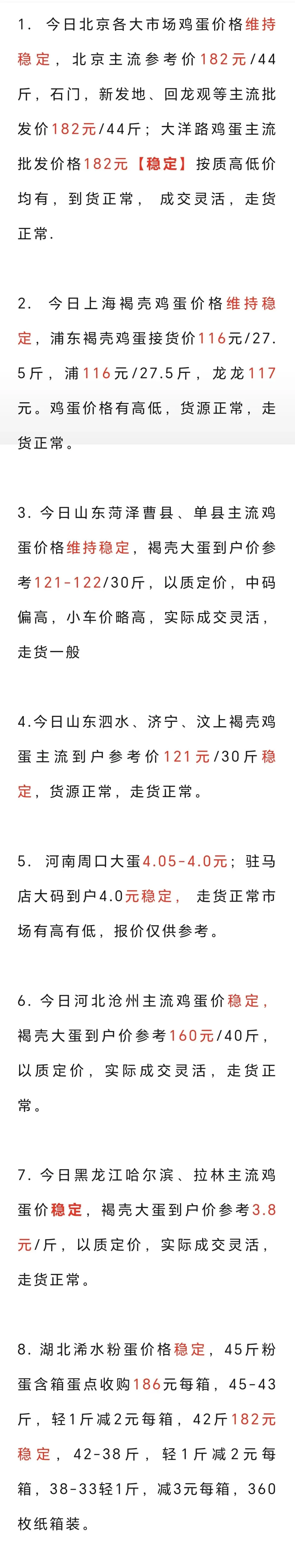 2026年4月21日各地鸡蛋价格(稳) 养羊网 2026-04-21 2026年4月21日各地鸡蛋价格(稳) 养羊网 2026-04-21 上一篇:河南·南阳硕宝合作社鸡蛋价格[2026年4月21日] 下一篇:猪价 | 2026.4.21~最新猪价 您可能还会对下面的文章感兴趣111: 相关文章 近期价格更新!!! 【超前猪价大预测】3月6日 ~3月8日!全国猪价大预测! 利润挺吓人的八大冷门创业 2026.2.21猪价出来了
