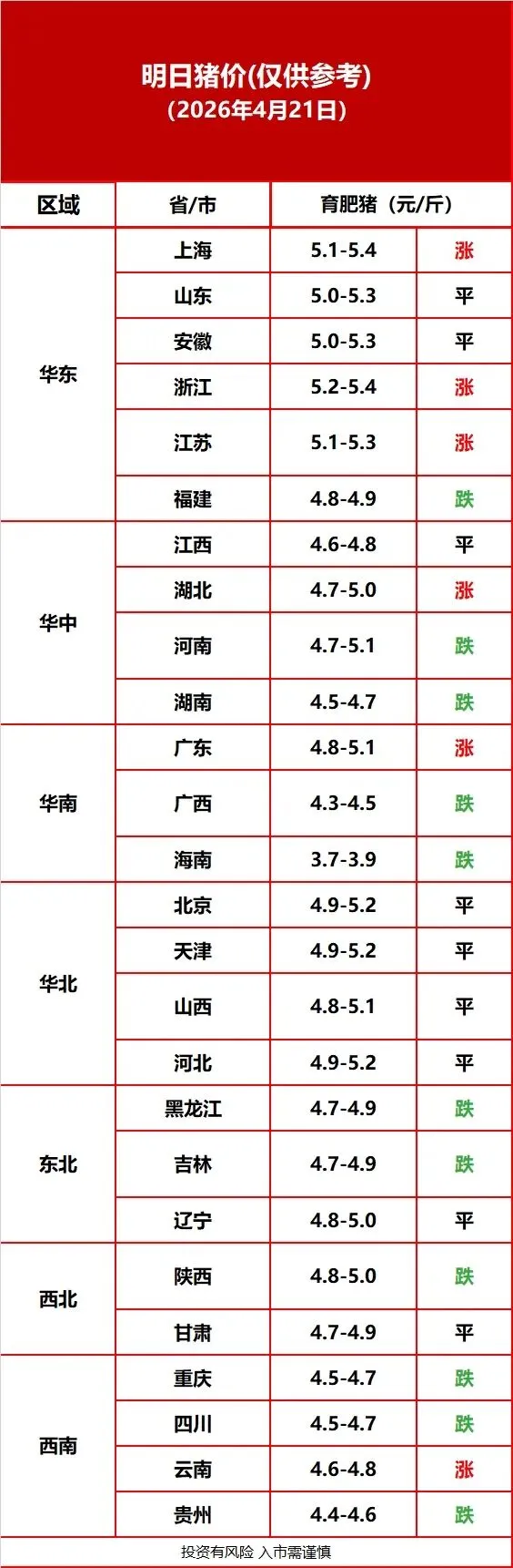【今日猪价】4月21日全国猪价:北方主产区偏弱下行,南方局部小幅上涨 养羊网 2026-04-21 【今日猪价】4月21日全国猪价:北方主产区偏弱下行,南方局部小幅上涨 养羊网 2026-04-21 上一篇:3.8元斤的猪价,到底是不是“金融危机”的前奏? 下一篇:微降丨今日鸡蛋价格(26年4月21日)参考 您可能还会对下面的文章感兴趣111: 相关文章 【超前猪价大预测】4月15日~4月18日 多地率先上涨,新一轮猪价上涨行情要来了? 新鲜牛羊肉,品质看得见 今天的鸡蛋你拿下了吗? 【黑龙江吉粮农牧】2026年3月25日猪价早知道