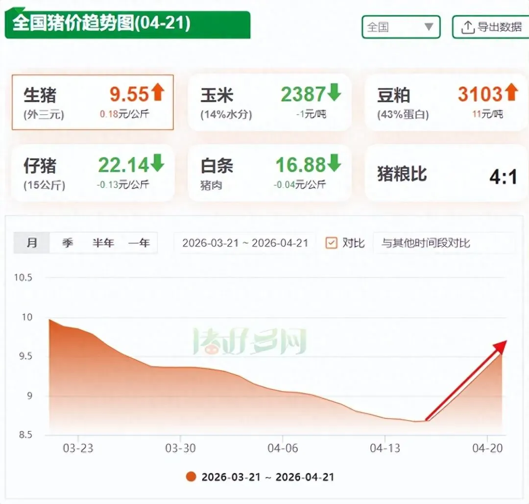 短短5天时间,全国猪价从8.67元/公斤反弹至9.55元/公斤,累计涨幅达10.15%,尤其是华北、华东地区领涨全国,局地猪价重回10元/公斤。与此同时,仔猪价格同步跟涨,7公斤仔猪均价止跌回升,养殖端悲观情绪快速扭转,市场行情要彻底反转了?