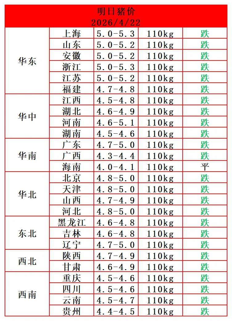 猪价多地又跌!2026.04.22鼎王猪价播报早知道! 养羊网 2026-04-21 猪价多地又跌!2026.04.22鼎王猪价播报早知道!立马收到明天最新猪价鼎王金猪就是长得快!订购电话:13980400130 养羊网 2026-04-21 上一篇:猪价呈现大部下跌,屠企采购难度减弱 下一篇:猪价一览|2026年4月22日 (明日猪价早知道) 您可能还会对下面的文章感兴趣111: 相关文章 美国最好吃的鸡蛋? 2025年4月13日全国各地生猪价格信息 ?4/1北京茅台今日行情一览??茅台回收 2025年4月13日全国各地生猪价格信息