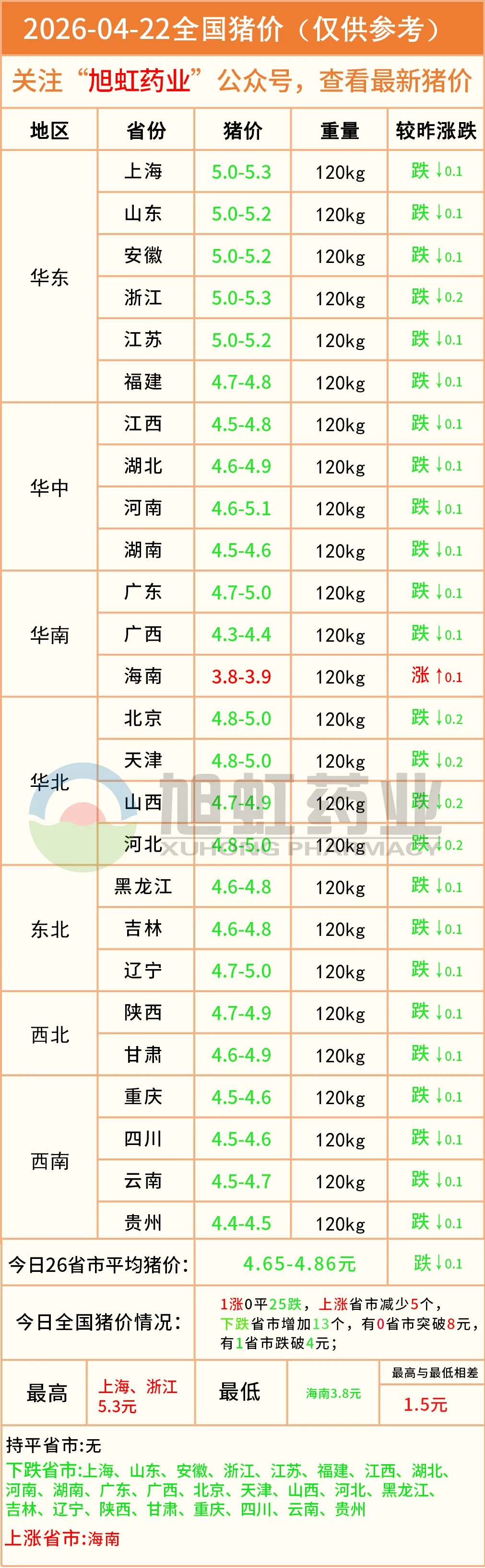 明日猪价——2026年04月22全国生猪价格! 养羊网 2026-04-21 明日猪价——2026年04月22全国生猪价格! 养羊网 2026-04-21 上一篇:猪价行情(2026.4.22)︱仅供参考 下一篇:【猪价预测】2026年4月23日至4月25日!全国猪价走势分析! 您可能还会对下面的文章感兴趣111: 相关文章 2026.2.23明天猪价报价! 【超前猪价大预测】3月4日~3月6日!5元区不断扩大,养殖户的春天在哪? 大家是怎么知道自己性取向的? 云南鸡蛋价格参考:3月27日!涨!