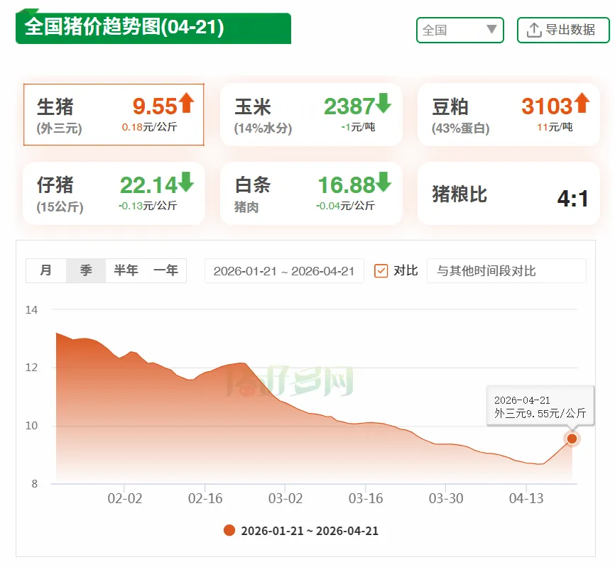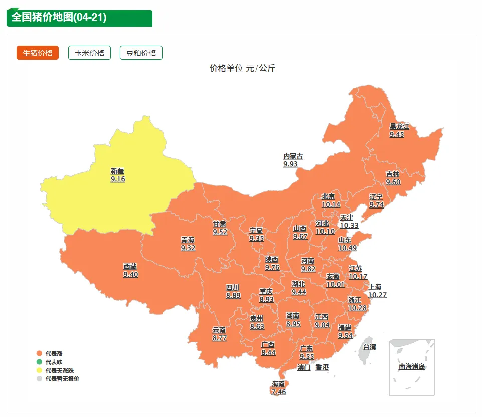 国家统计局4月上旬公布的官方口径里,外三元生猪价格仍只有9.1元/公斤,较3月下旬再跌4.2%;但根据猪好多平台监测,在4月15日价格触底之后,截至4月21日全国外三元生猪均价已实现六连涨,目前均价已回升至9.55元/公斤,所有省份报价止跌,且除新疆外报价全部上行,北京、天津、河北、山东、浙江、上海等地重新站上10元/公斤。