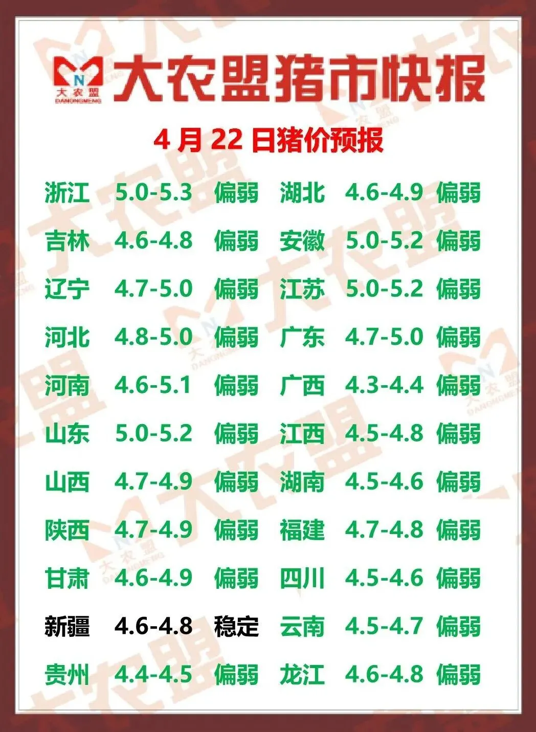 2026.04.22全国猪价信息(猪价一片绿油油!)何时卖猪,扫码咨询! 养羊网 2026-04-21 2026.04.22全国猪价信息(猪价一片绿油油!)何时卖猪,扫码咨询! 养羊网 2026-04-21 上一篇:今日猪价(2026.4.21) 下一篇:2026年4月22日全国猪价最新走势 您可能还会对下面的文章感兴趣111: 相关文章 2026年3月15日 川渝鸡蛋价格参考! 2025年4月13日全国各地生猪价格信息 这个夏天,菜价猛涨 自己养羊自己卖羊肉,自己刨羊肉圈,纯放山