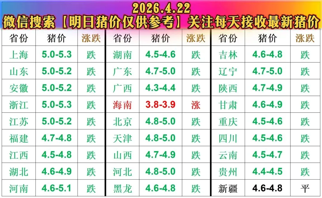 2026年4月22日全国生猪价格整体呈普跌态势,多数省份猪价集中在4.3-5.3元/斤区间。仅海南小幅上涨(3.8-3.9元/斤)、新疆持平(4.6-4.8元/斤),其余地区全部下跌。其中,华东地区(上海、山东、安徽、浙江、江苏)猪价相对偏高,在5.0元/斤以上;华南、西南地区猪价偏低,广西、贵州等地跌至4.3-4.5元/斤,海南更是跌破4元/斤,为全国最低。