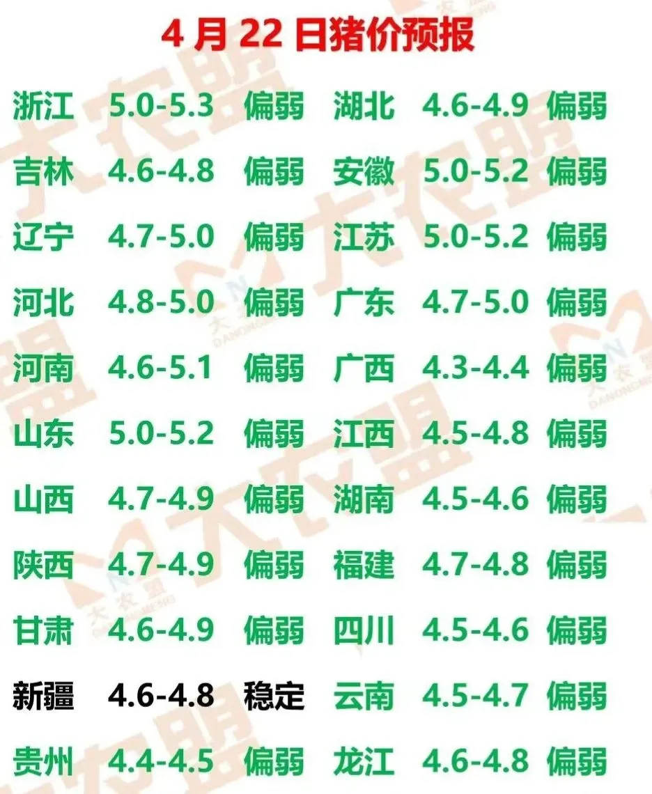 2026.04.22全国猪价信息(猪价一片绿油油!) 养羊网 2026-04-21 2026.04.22全国猪价信息(猪价一片绿油油!) 养羊网 2026-04-21 上一篇:猪价反弹逻辑 下一篇:4月21日今日猪价牛价小麦价玉米价稻谷价 您可能还会对下面的文章感兴趣111: 相关文章 猪价连涨4天!官方定调叠加猪价回暖,生猪市场能否迎来真正反转? 农村散养土鸡蛋,9毛多一个贵嘛!保真 是该支持还是让我爸放弃算了 【明天猪价】 2026.2.18(指导价仅供参考)