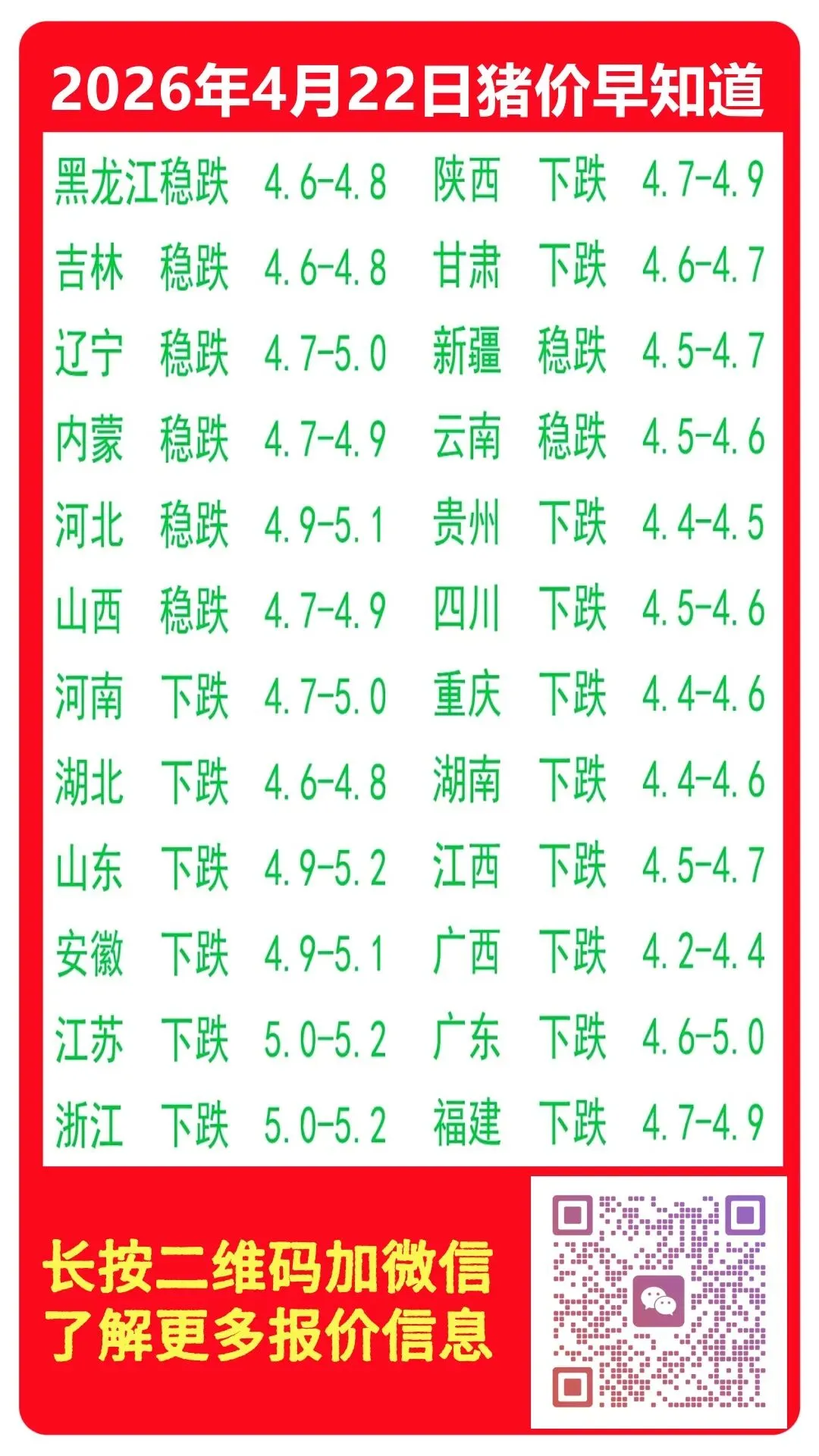 继续下跌!2026年4月22日全国猪价继续下跌!! 养羊网 2026-04-21 继续下跌!2026年4月22日全国猪价继续下跌!! 养羊网 2026-04-21 上一篇:2026.4.22 --猪价 下一篇:猪价何时涨?短期震荡后,下半年或迎真正行情# 您可能还会对下面的文章感兴趣111: 相关文章 2026.4.19鸡蛋价格 【猪价】2026.01.14福建各地区每日最新猪价 偷工减料且涨价 阿尔巴斯山羊?