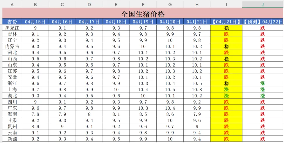 4-21号猪价(仅供参考)一、全国猪价 全国均价:9.72 元 / 公斤(4.86 元 / 斤),较昨日微跌?0.04 元 / 公斤涨跌分布:2 省上涨、9 省下跌、17 省持稳