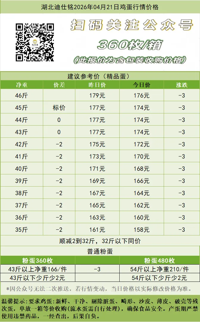 湖北迪仕铭2026年04月21日鸡蛋行情价格 养羊网 2026-04-22 湖北迪仕铭2026年04月21日鸡蛋行情价格 养羊网 2026-04-22 上一篇:4月22日南宁鸡蛋参考价格:梅雨季节,清库存为主! 下一篇:猪价大变!【明天猪价】4月23日全国猪价涨跌表! 您可能还会对下面的文章感兴趣111: 相关文章 近期价格更新!!! ??$4.49/磅!华人最爱整羊它来啦! 北京市电气高级职称评审现状 2025年4月13日全国各地生猪价格信息