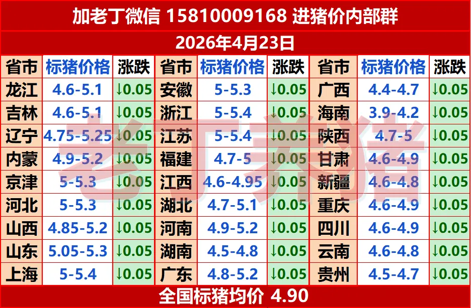 猪价大变!【明天猪价】4月23日全国猪价涨跌表! 养羊网 2026-04-22 猪价大变!【明天猪价】4月23日全国猪价涨跌表! 养羊网 2026-04-22 上一篇:湖北迪仕铭2026年04月21日鸡蛋行情价格 下一篇:猪价腰斩18个月!养殖户为何越亏越养?三大残酷真相曝光 您可能还会对下面的文章感兴趣111: 相关文章 近期价格更新!!! 2025年4月13日全国各地生猪价格信息 生猪:猪价短时有支撑,关注企业出栏节奏 鸡蛋价格一览|2026年1月13日鸡蛋价格(明日早知道)
