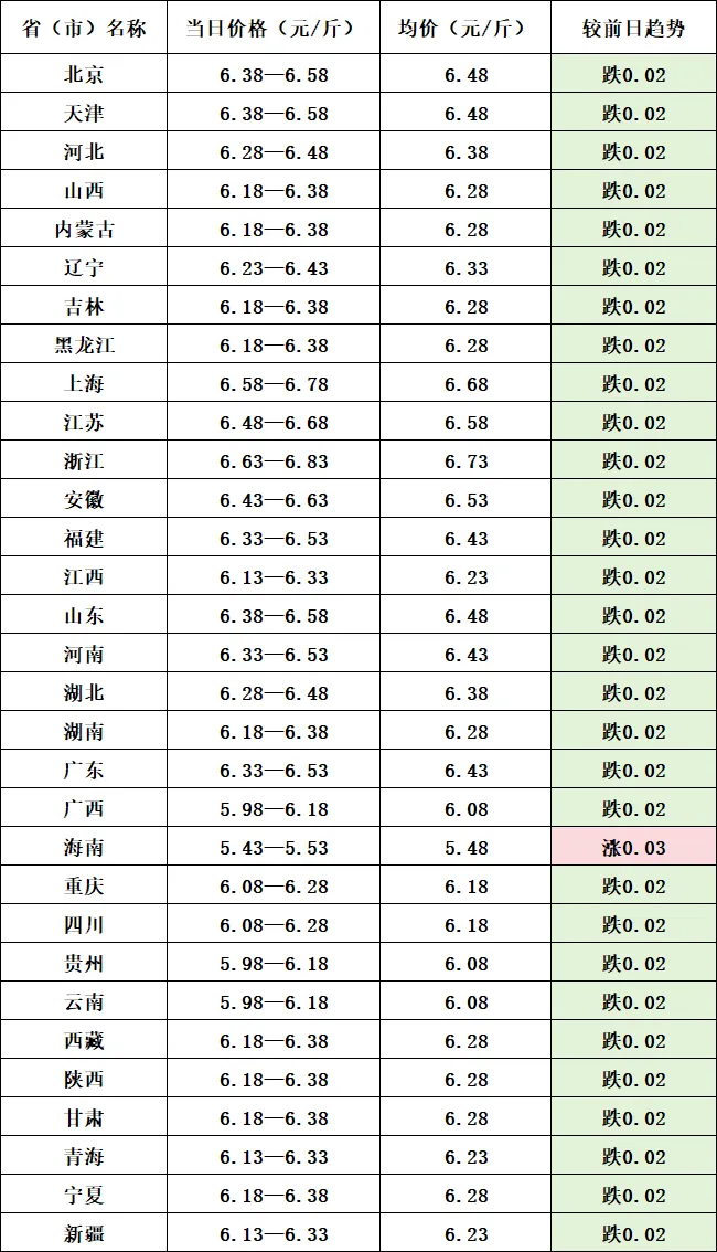 全国白条肉均价:6.30元/斤