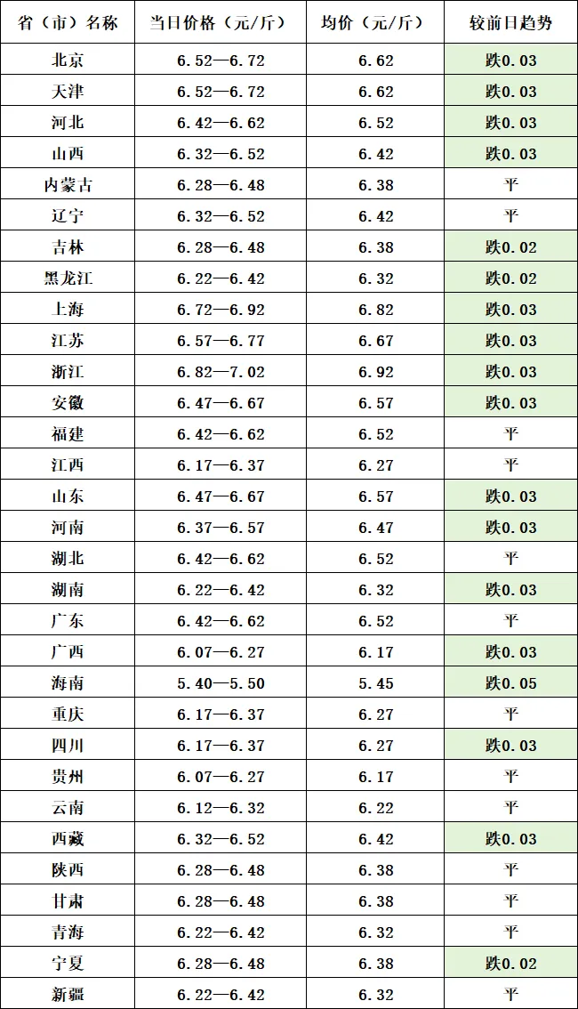 全国白条肉均价:6.38元/斤