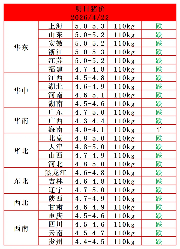 2026.4.22-今日最新猪价 养羊网 2026-04-22 2026.4.22-今日最新猪价 养羊网 2026-04-22 上一篇:猪价反弹背后的隐忧:涨势能否持续,养殖户该如何抉择? 下一篇:【鸡蛋报价】2026年4月21日 您可能还会对下面的文章感兴趣111: 相关文章 2025年4月13日全国各地生猪价格信息 2025年4月13日全国各地生猪价格信息 谁在操控咱们的猪价?4股力量说了算,养殖户看完心里透亮! 蛋友佳鲜鸡蛋报价2026.2.12(星期四)