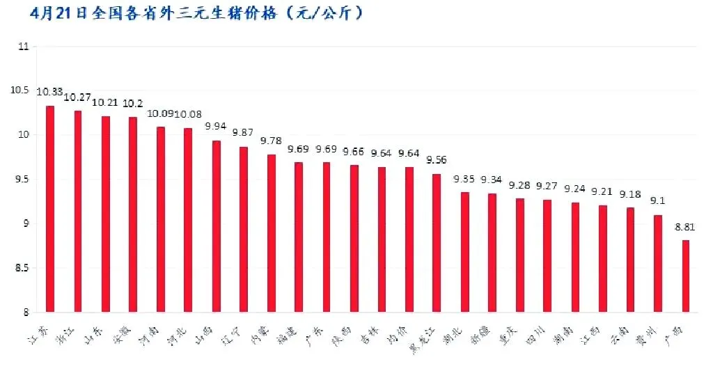 4月21日全国外三元生猪出栏均价为9.64元/公斤,较昨日下跌0.16元/公斤,最低价海南8.16元/公斤,最高价江苏10.33元/公斤。