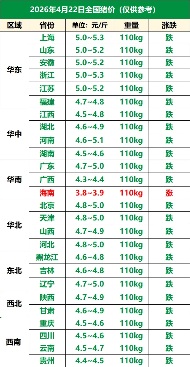 4月22日全国猪价跌猛了,下跌“势如破竹”! 养羊网 2026-04-22 4月22日全国猪价跌猛了,下跌“势如破竹”! 养羊网 2026-04-22 上一篇:2026年4月22日山东鸡蛋价格实报 下一篇:2026 4. 23 猪价!! 您可能还会对下面的文章感兴趣111: 相关文章 2026.03.05鸡蛋最新价格报价 近期价格更新!!! 盐池滩羊:舌尖上的“塞上明珠” 猪价跌至近七年最低点,“不破不立”或能绝处逢生