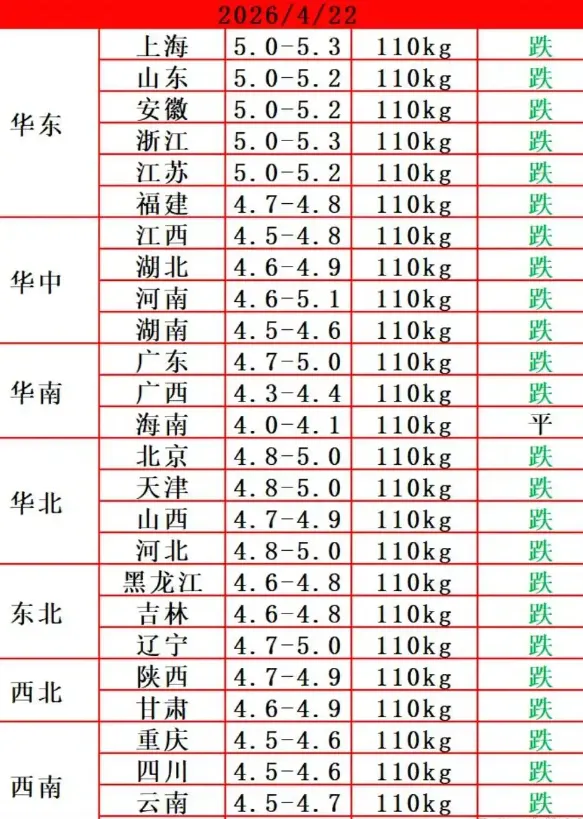 【柯恩·今日猪价】4月22日生猪价格 养羊网 2026-04-22 【柯恩·今日猪价】4月22日生猪价格全国统一咨询热线:4001-116-116需要饲料请拨打订货热线赣州:0797-8462111南昌:0791-85776699漳州:0596-6831299常德:0736-5696855茂名:0668-7303717 养羊网 2026-04-22 上一篇:4月22日 | 正业生物猪价快报! 下一篇:福建省2026.4.22猪价 ——福建江山益民 您可能还会对下面的文章感兴趣111: 相关文章 第39篇:什么是【猪周期】? 隐N的手段聪明得我都想拍手称赞了? 今日猪价(2026.4.22)|全国毛猪白条猪肉价格 ??薅鸡蛋?攻略来了
