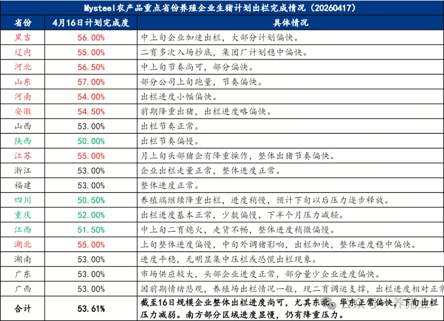 4月上旬,全国生猪出栏进度偏快,但区域略显分化。据Mysteel农产品监测,截至4月17日,样本企业总体出栏进度为53.61%,整体出栏节奏尚可,尤其北方及华东企业出栏进度偏快,下旬出栏压力有所减轻。