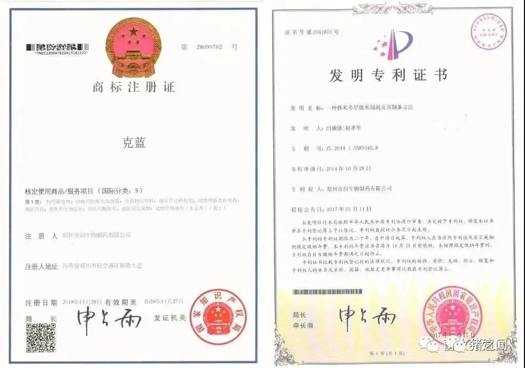 研究历程:克蓝是畅销产品从08年开始就已经使用,历经十多年年逐步完善,2016年初上报农业部门经过一年的论证研究证实,证明克蓝套餐,针对蓝耳,圆环,副猪,支原体,链球菌,具有很好的净化治疗效果,最后颁发克蓝套餐专利证书让更多养殖朋友信任产品,并且名字申请了商标证书,是具有唯一行,专属优润集团专用。下图是产品专利证书,商标注册证书.