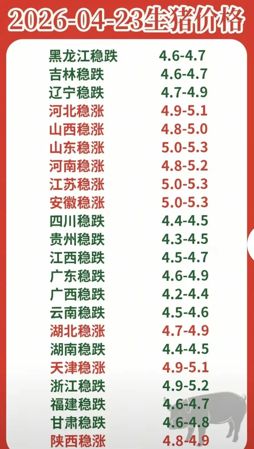 2026.04.23明日猪价又有新变化 养羊网 2026-04-22 2026.04.23明日猪价又有新变化华谷饲料 ? 遥遥领鲜 ? 养羊网 2026-04-22 上一篇:2026.4.23明日最新猪价信息! 下一篇:【鸡蛋价格】2026.4.23日,鸡蛋价格早知道 您可能还会对下面的文章感兴趣111: 相关文章 2月26日宁夏鸡蛋价格参考 2月26日鸡蛋价格 猪价跌到4元,只差临门一脚!猪企3月出栏大涨22%,猪价还得跌? 近期价格更新!!!