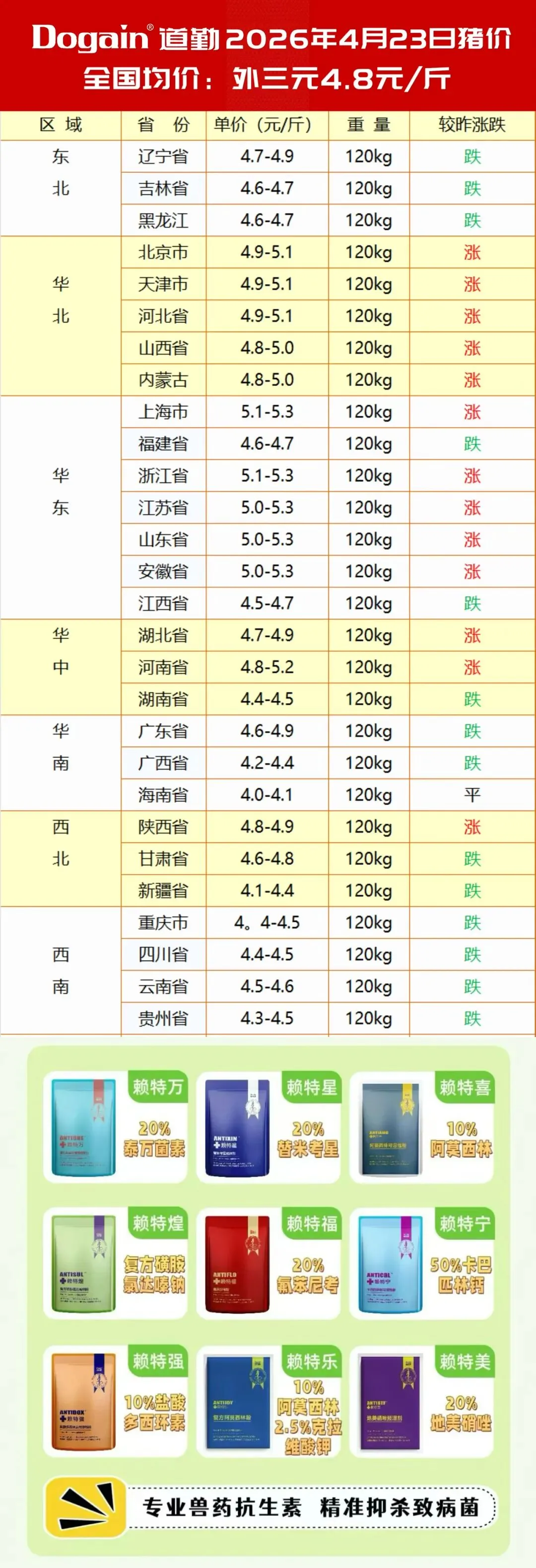 4月23日,猪价信息 养羊网 2026-04-22 4月23日,猪价信息 养羊网 2026-04-22 上一篇:明日猪价 (2026.4.23) 下一篇:4 月 22 日:深圳鸡蛋价格参考 您可能还会对下面的文章感兴趣111: 相关文章 1500?已出建模+渲染+后期 2025年4月13日全国各地生猪价格信息 未来三个月猪价预测(2026年3-7月) 猪价大涨一日游,集团猪砸盘,散户怎么办?丨附明日2.4猪价