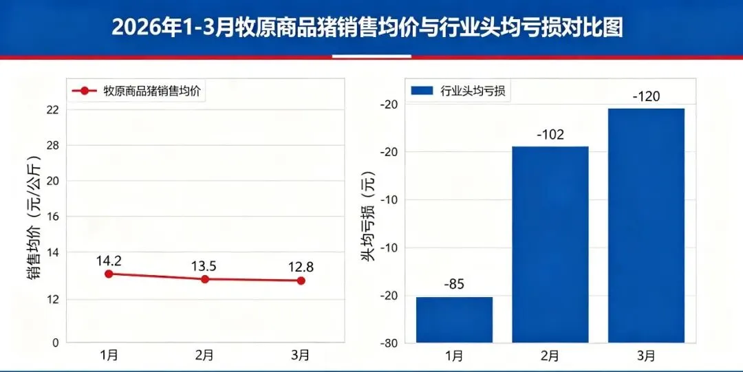 牧原股份一季度亏损的核心原因,直指持续走低的生猪价格。从公司此前发布的销售数据来看,一季度商品猪销售均价逐月大幅跳水,1-3 月价格分别为 12.57 元 / 公斤、11.59 元 / 公斤、9.91 元 / 公斤,其中 3 月均价同比降幅高达 30.70%,对应的商品猪销售收入也同比下滑 32.73%。