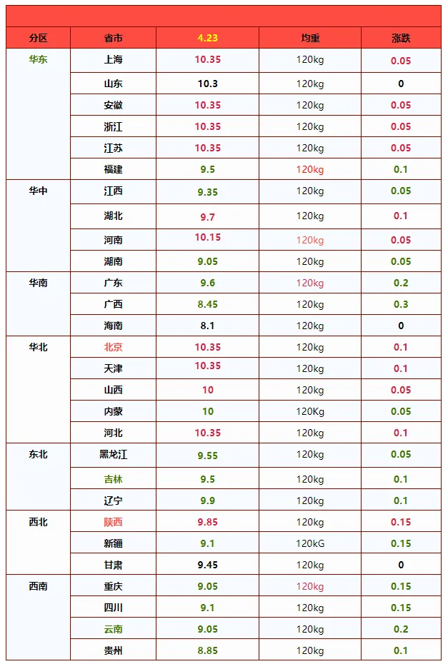 据最新调价数据,预计4月23日外三元标猪报价在9.53元/公斤左右,市场以窄幅偏弱为主,涨跌拉锯。