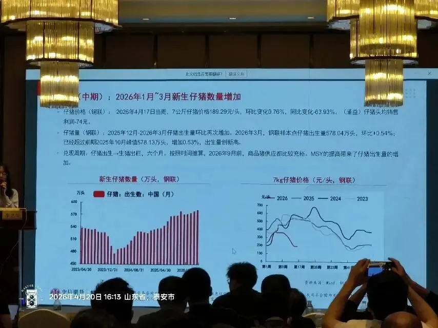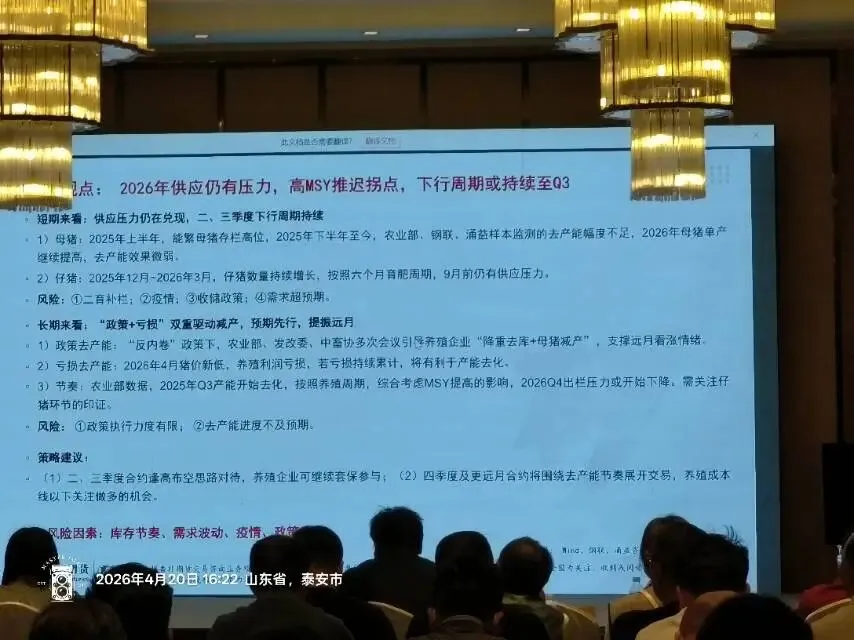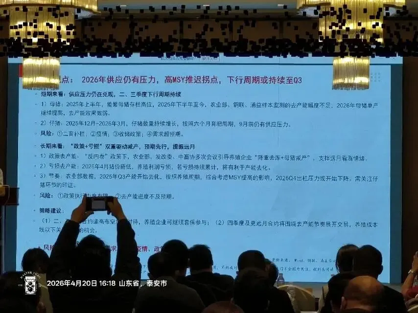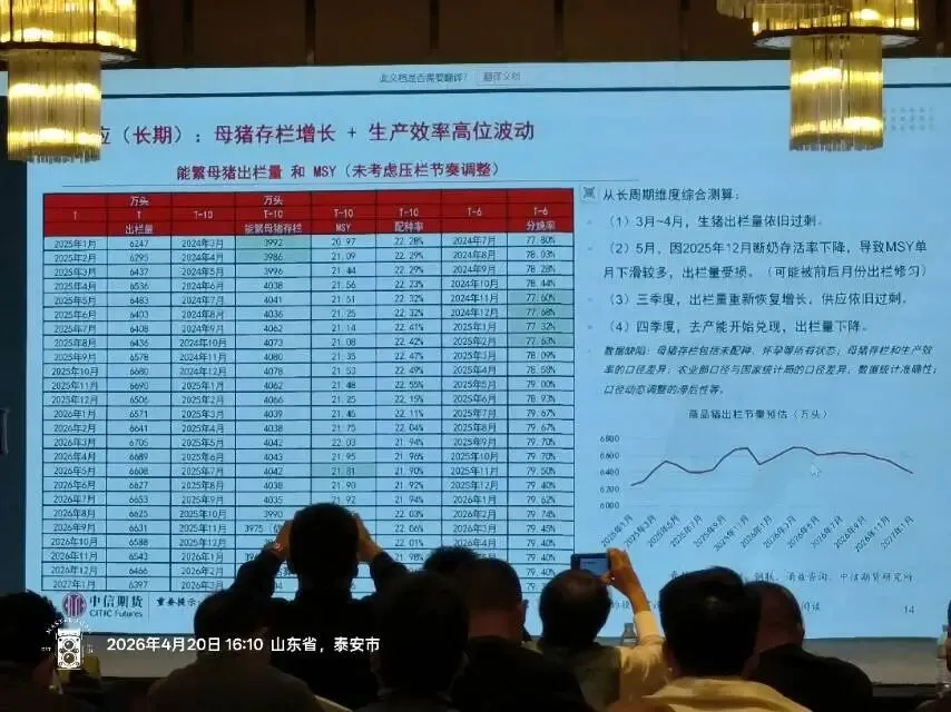 2026年4月的山东泰安,一场聚集了众多生猪行业人士的论坛正在举行。会议室里坐满了人,大屏幕上不断切换着数据和图表,台下的听众们神情专注,不少人举起手机记录下每一页重要的内容。 中信期货分析师王祖力站在讲台上,他的演讲题目直击要害——“能繁母猪出栏量和MSY(未考虑压栏节奏调整)”。