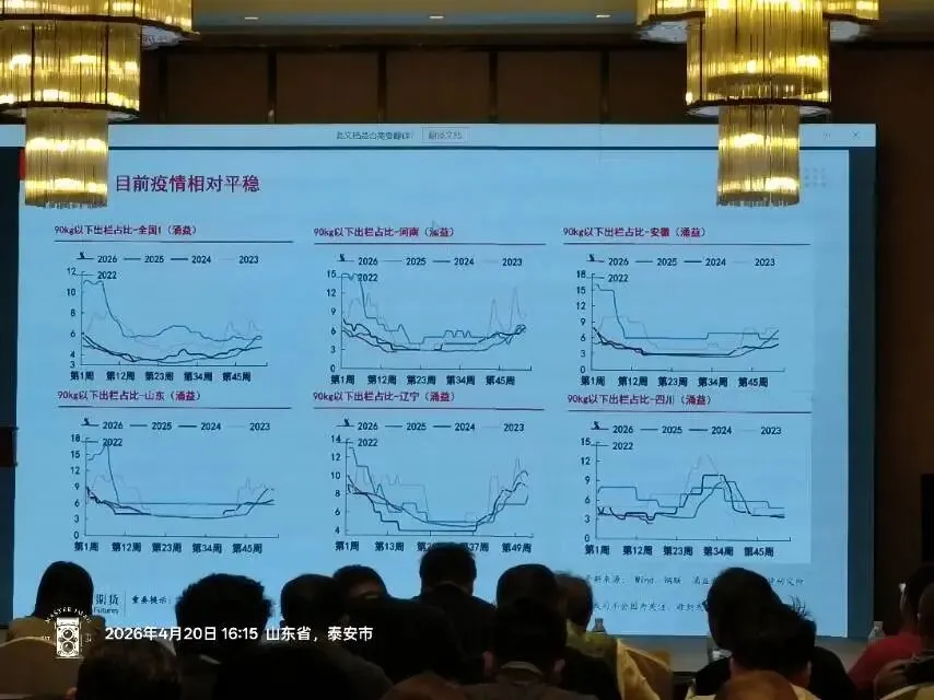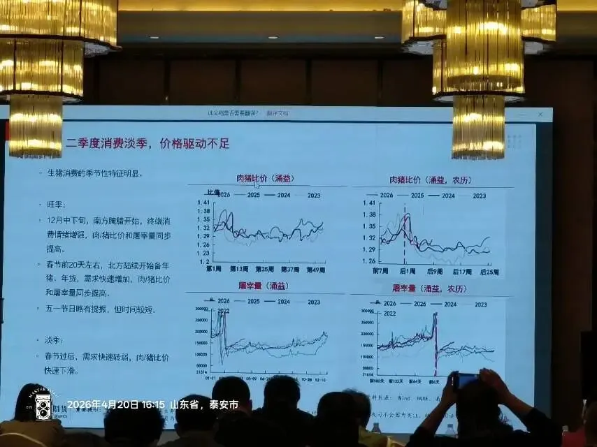 PPT上显示着从2025年1月到2026年12月的详细数据表格。出栏量、能繁母猪存栏、MSY、配种率、分娩率等关键指标一一呈现,数字背后是行业不容乐观的现实。 “3月到4月,生猪出栏量依旧过剩。”王祖力的声音在会场回荡,“5月,因2025年12月断奶存活率下降,导致MSY单月下滑较多,出栏量受损。但这种情况可能被前后月份出栏修匀。” 他继续分析:“三季度,出栏量重新恢复增长,供应依旧过剩。四季度,去产能开始兑现,出栏量下降。” 王祖力特别提到数据的局限性:母猪存栏包括未配种、怀孕等所有状态,不同机构统计口径存在差异,数据统计的准确性和口径动态调整的滞后性都会影响判断。