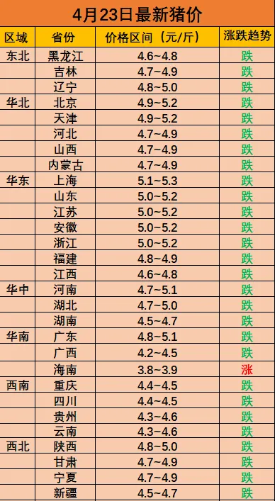4月23日最新猪价!!!全线下跌,一片绿!!