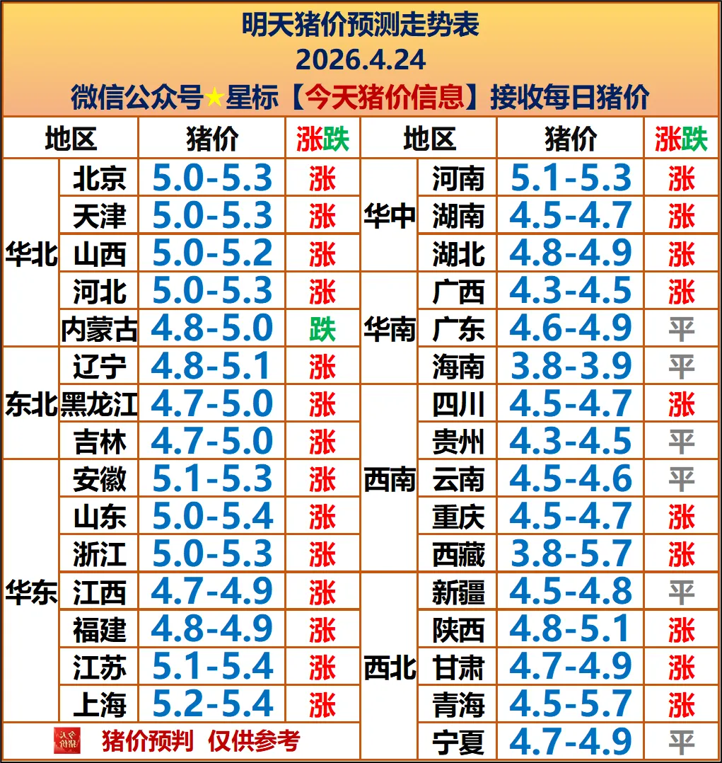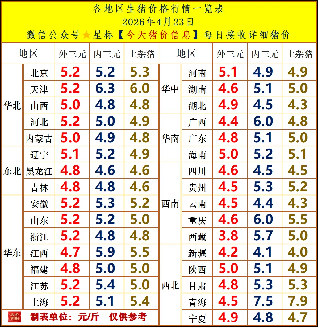 今日猪价 | 2026.4.24明天猪价早知道!2026年04月23日猪价行情: 外三元:4.84元/斤,较昨日下跌0.01元 内三元:4.98元/斤,较昨日下跌0.03元 土杂猪:4.79元/斤,较昨日下跌0.03元