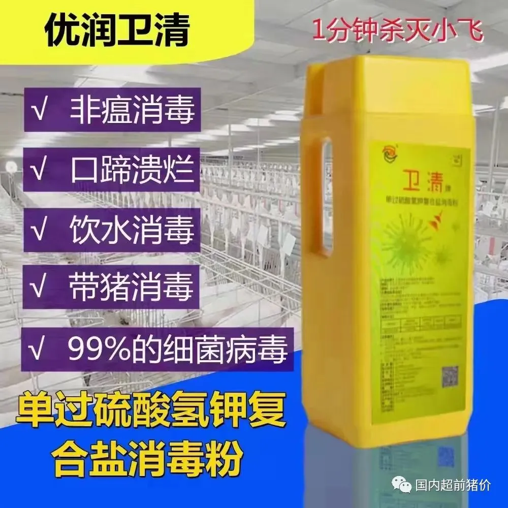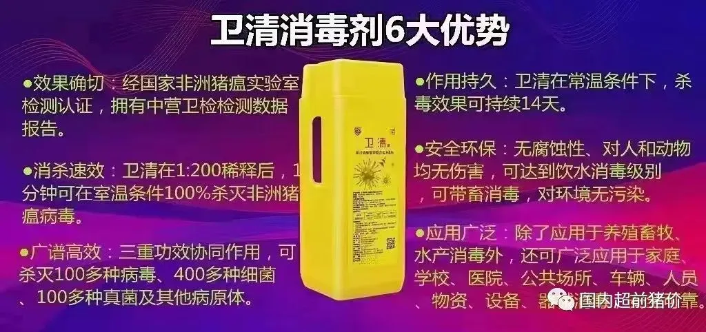 第三使用对象上面,卫清能够直接带猪消毒的,而且不用担心消毒次数,包括直接拌水饮用都是可以的,其他消毒剂往往带有腐蚀性,刺激性大,甚至带毒,所以不可带猪消毒,