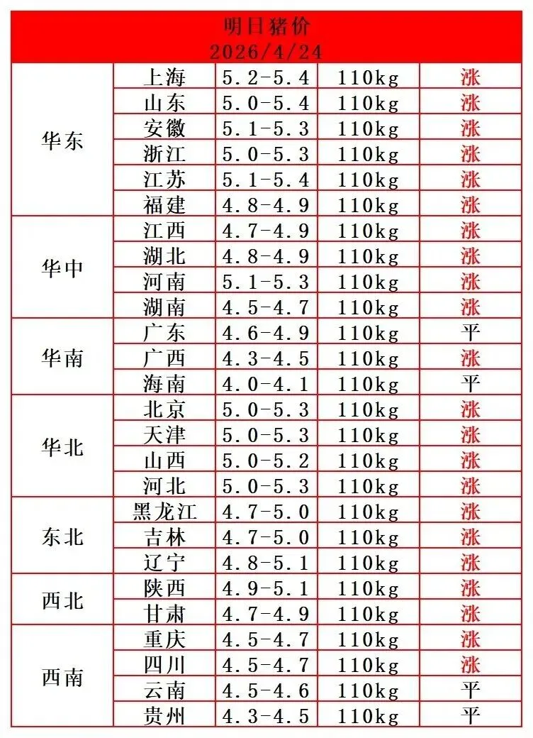 2026.4.24明日猪价 养羊网 2026-04-23 2026.4.24明日猪价 养羊网 2026-04-23 上一篇:【超前猪价】4月25-4月27日 猪价!全国猪价大预测 下一篇:2026.4.24-最新猪价行情(强力拉升,涨 涨 涨!猪价全面上涨!) 您可能还会对下面的文章感兴趣111: 相关文章 2026年1月30日《葫芦蛋》鸡蛋价格 百草卤味 2026年3月31日鸡蛋价格早报:措手不及,突现大落. 猪价偏弱调整,仅浙江一地上涨!明日预计行情:1涨13平13跌!附3月10日最新全国生
