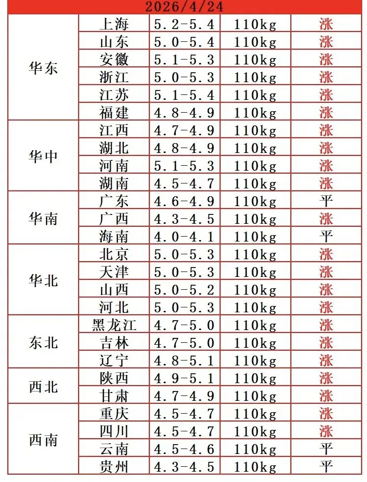2026.4.24日猪价 养羊网 2026-04-23 2026.4.24日猪价 养羊网 2026-04-23 上一篇:【鸡蛋价格】2026.4.24日,鸡蛋价格早知道 下一篇:猪价一览|2026年4月24日 (明日猪价早知道) 您可能还会对下面的文章感兴趣111: 相关文章 近期价格更新!!! 明日猪价【2026年2月16日】全国猪价来啦! 猪价跌穿10元大关!产能洪水与需求寒冬的至暗时刻,何时迎来绝地反击? 2025年4月13日全国各地生猪价格信息