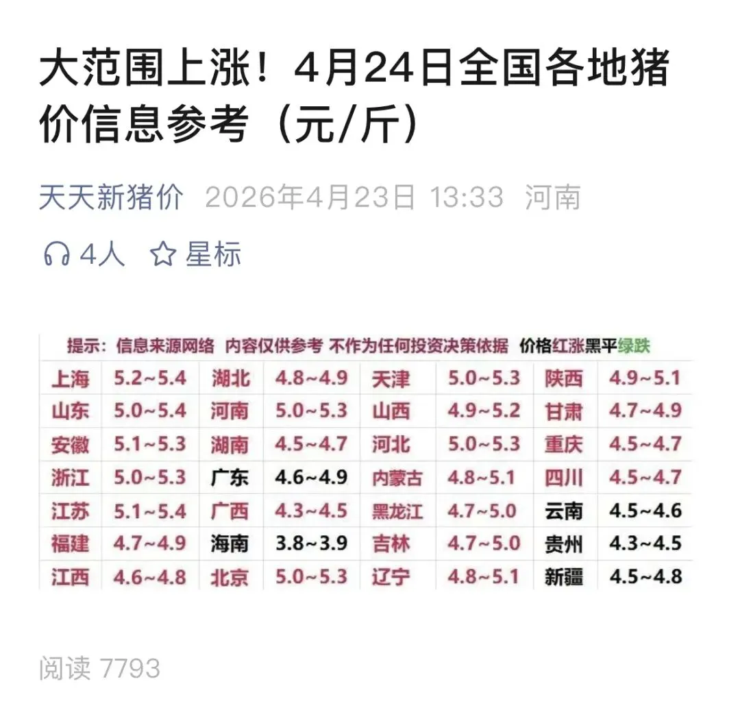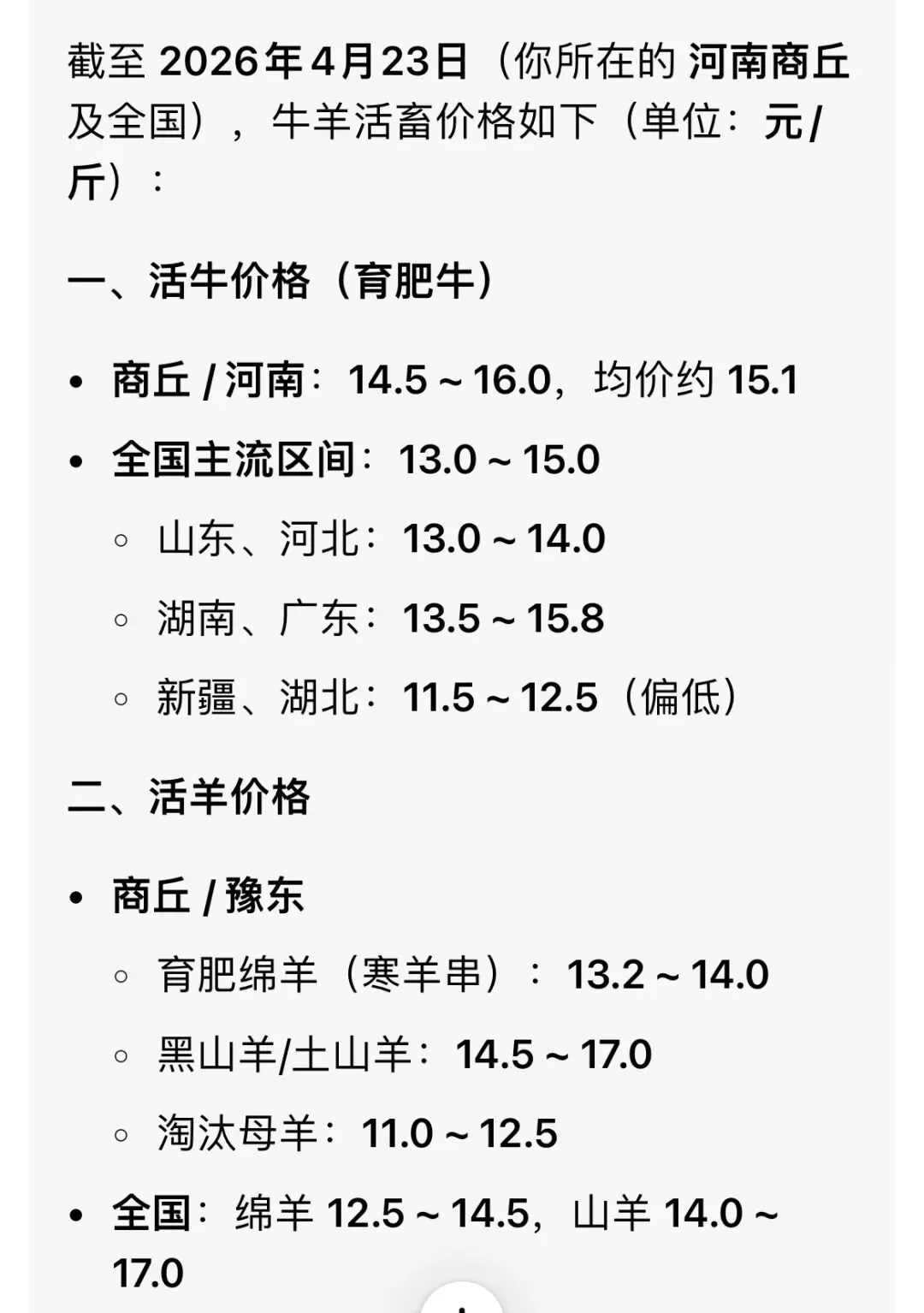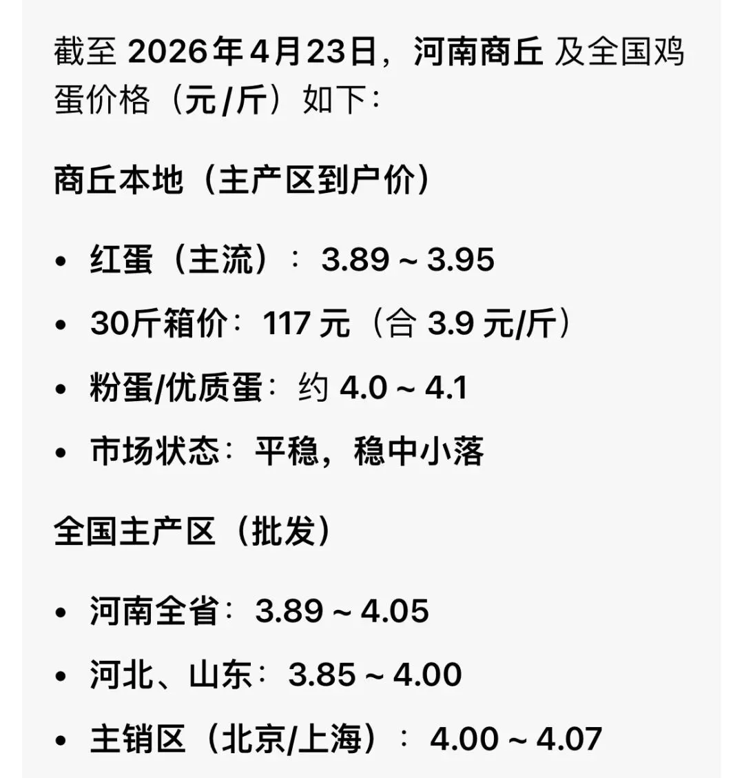 今日畜禽及鸡蛋价格(元/斤) 养羊网 2026-04-23 今日畜禽及鸡蛋价格(元/斤) 养羊网 2026-04-23 上一篇:2026.04.24全国猪价信息(猪价新一轮上涨开始!)何时卖猪,扫码咨询! 下一篇:猪价丨4月24日 明日猪价早知道 您可能还会对下面的文章感兴趣111: 相关文章 2026年4月23日鸡蛋价格,仅供参考 前天市场荔枝的报价 羊肺炎打什么针最有效?羊肺炎的症状与用药 2025年4月13日全国各地生猪价格信息