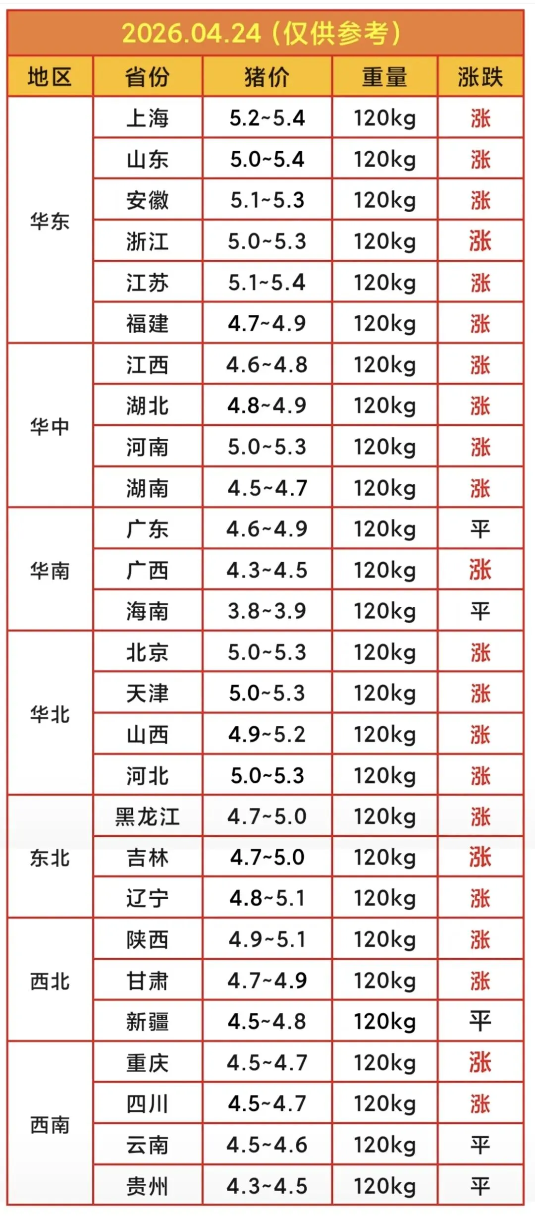 2026年4月24日全国猪价最新走势 养羊网 2026-04-23 2026年4月24日全国猪价最新走势 已关注 关注 重播 分享 赞 视频详情 ? ? ?? ? ? ?全国猪价最新价格参照:催肥界的王炸产品??【肉畜肽白金】-央视上榜品牌国家专利超分子“胶束中药”成分,育肥猪健康增重催肥,节约成本,真正帮咱们养殖户创富增收??? 已关注 关注 重播 分享 赞 视频详情 已关注 关注 重播 分享 赞 视频详情 已关注 关注 重播 分享 赞 视频详情 养羊网 2026-04-23 上一篇:2026.4.24 ▏猪价早知道(牛气冲天,猪价又是满堂红!) 下一篇:【明天猪价】2026年04.24最新(猪价又红了!) 您可能还会对下面的文章感兴趣111: 相关文章 近期价格更新!!! 26.02.17明日猪价早知道(祝天下养猪的朋友们马年发大财!) 写在猪价即将破5之际 2026.4.8-鸡蛋价格