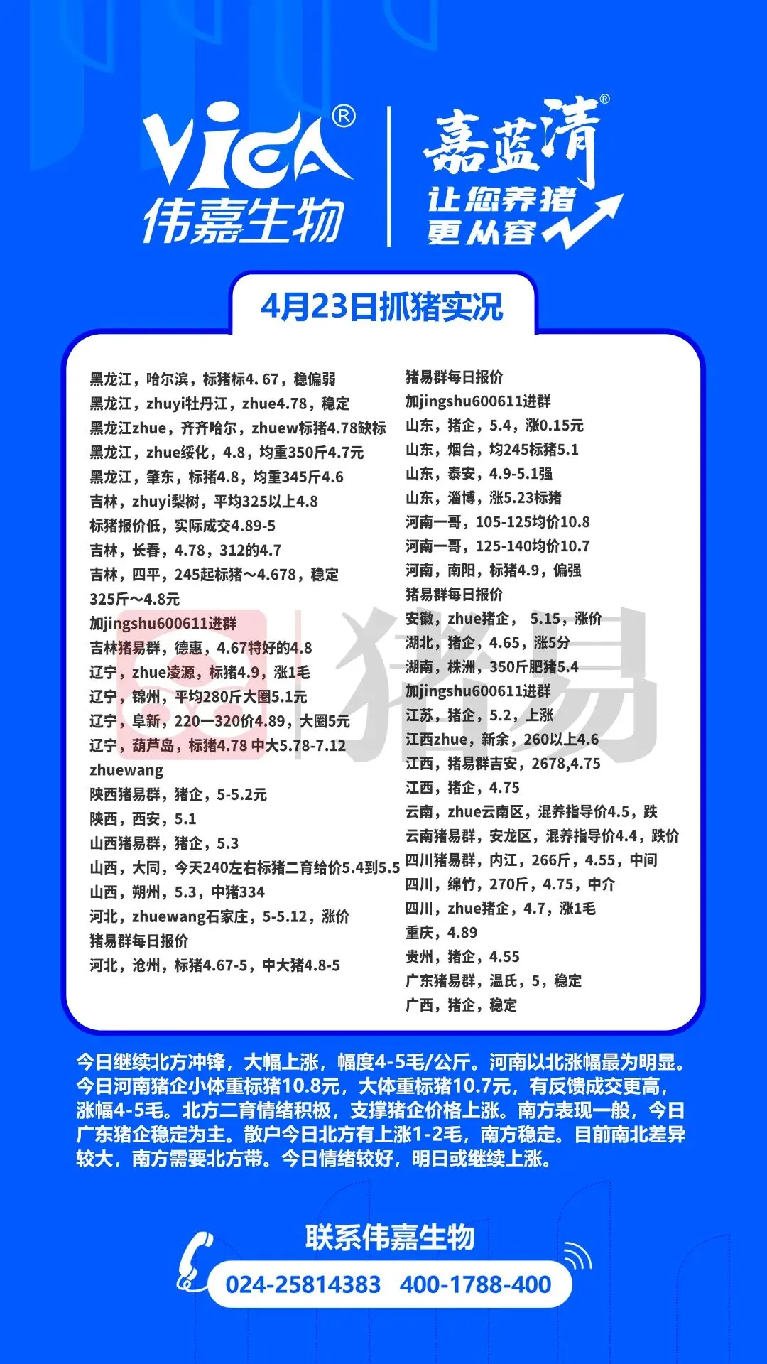 今日继续北方冲锋,大幅上涨,幅度4-5毛/公斤。河南以北涨幅最为明显。今日河南猪企小体重标猪10.8元,大体重标猪10.7元,有反馈成交更高,涨幅4-5毛。北方二育情绪积极,支撑猪企价格上涨。南方表现一般,今日广东猪企稳定为主。散户今日北方有上涨1-2毛,南方稳定。目前南北差异较大,南方需要北方带。今日情绪较好,明日或继续上涨。