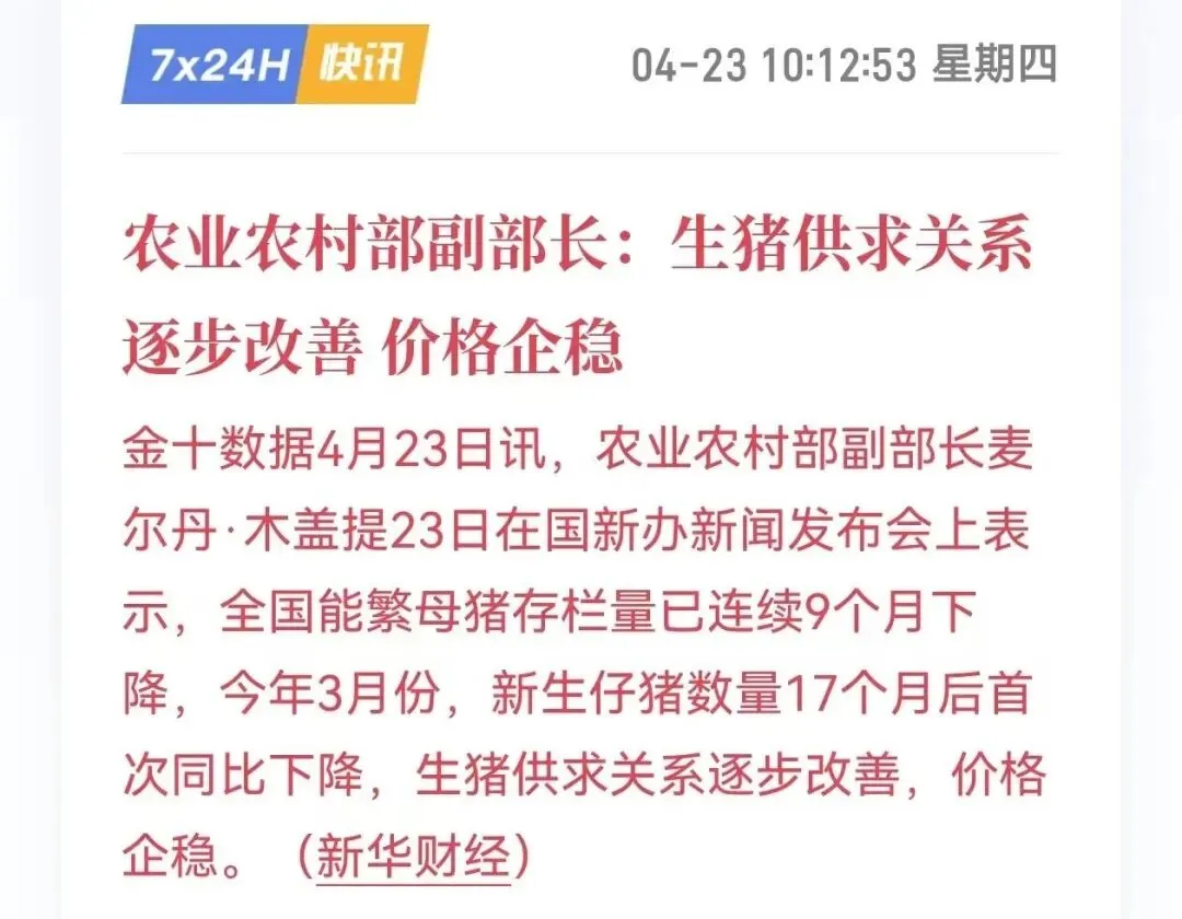 3、生猪供求关系逐步改善,价格已经企稳副部长原话是“供求关系逐步改善,价格企稳”。官方用了“企稳”这个词,说明底部大概率已经探明。