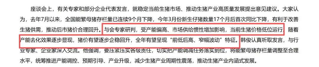 此前,4月17日农业农村部召开生猪产业发展座谈会上也提到,随着产能去化效果逐步显现,猪价有望逐步企稳回升,全年有望呈现“前低后高、窄幅波动”特征。要进一步完善生猪产能综合调控政策,采取有力有效举措推动猪价合理回升。