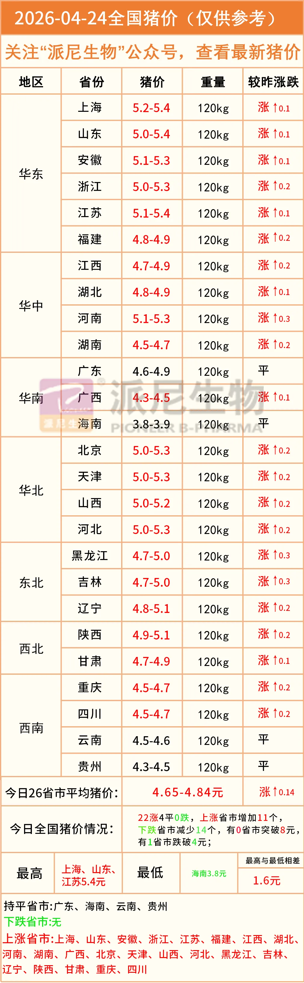 明日猪价 | 2026.4.24日~全国各地最新猪价! 养羊网 2026-04-23 明日猪价 | 2026.4.24日~全国各地最新猪价! 养羊网 2026-04-23 上一篇:4月23日全国猪价再迎上涨【动力猪价】 下一篇:猪价上涨!4月24日猪价参考 您可能还会对下面的文章感兴趣111: 相关文章 感恩前几个月狂吃毛绒的自己? 01月29日宜春褐壳鸡蛋价格 养猪业生死时速:2025年持续亏损,你准备吧 坐标上海?