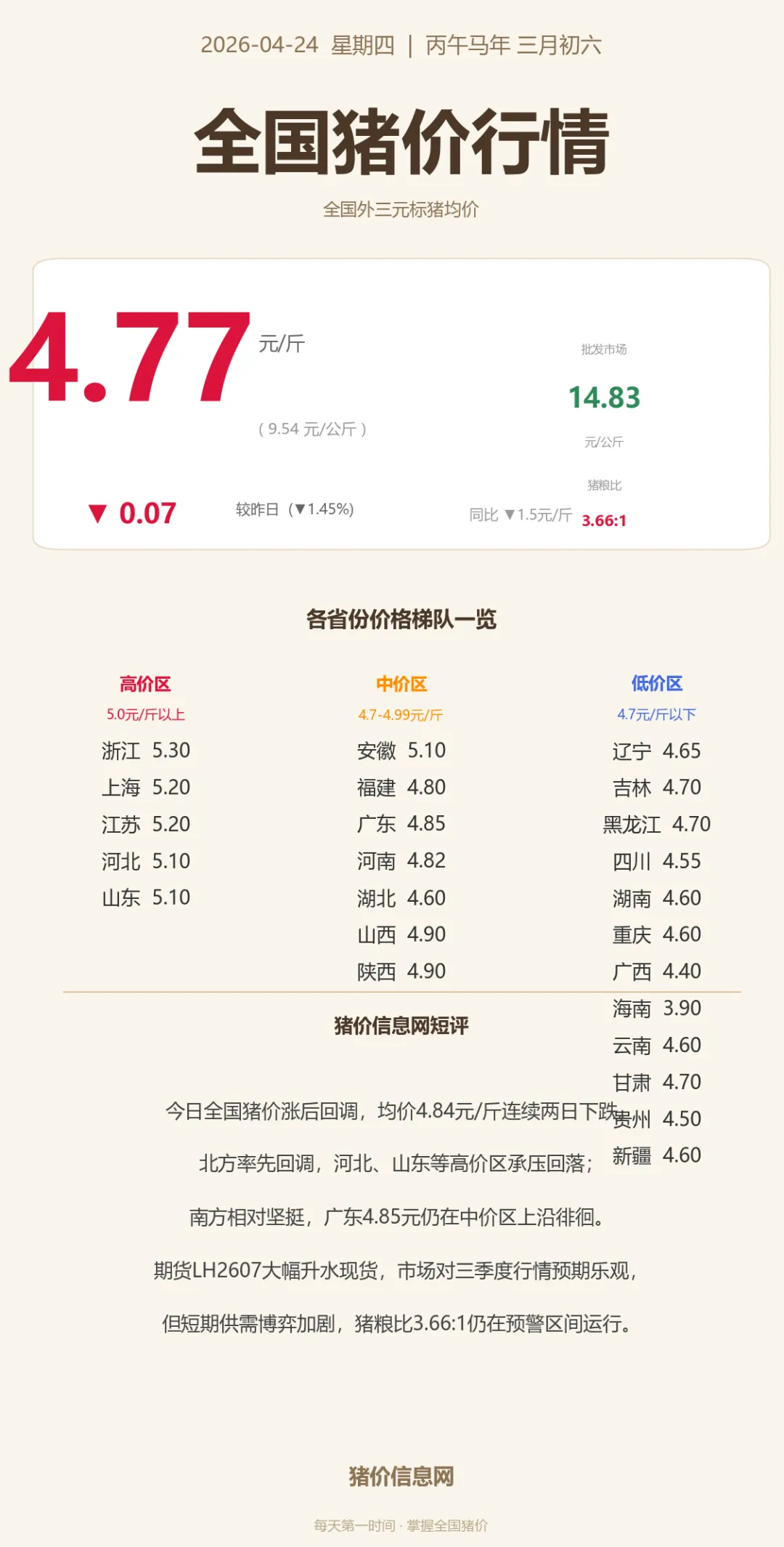 今日全国外三元标猪均价4.77元/斤(9.54元/公斤),较昨日下跌0.07元,跌幅收窄至1.45%,连续两日回调但降速明显放缓。南北分化加剧:华东相对抗跌,江苏5.16元/斤领涨全国;华南延续弱势,广西跌至4.40元新低。批发市场白条均价14.83元/公斤企稳回升,猪粮比4.02:1,深度亏损格局未改。