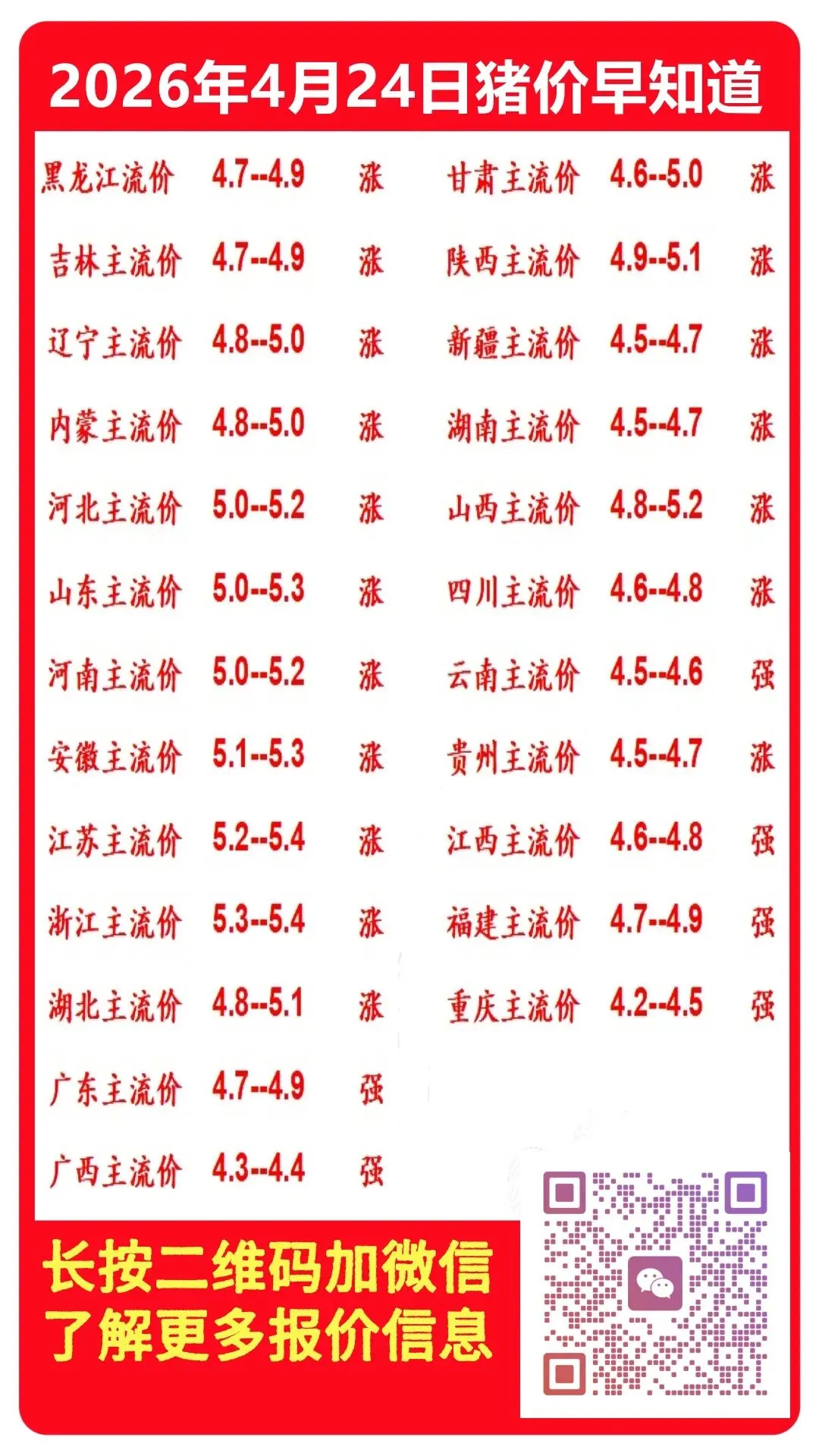 暴涨模式开启!2026年4月24日全国猪价一片红! 养羊网 2026-04-23 暴涨模式开启!2026年4月24日全国猪价一片红! 养羊网 2026-04-23 上一篇:【2026年04月24日】猪价跌势收窄!五一备货启动,真正的"拐点"要来了? 下一篇:养羊最佳的自配饲料配方,拿走不谢! 您可能还会对下面的文章感兴趣111: 相关文章 令人心动的农学 【猪价预测】2026年1月13日~2026年1月15日全国猪价! 2月20日东莞信立农批鸡蛋价格 19日,新发地牛羊价格