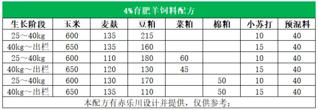 玉米粉21.5%,草粉21.5%,豆饼21.5%,玉米粒17%,花生饼10.3%,麦麸6.9%,食盐0.7%,尿素0.3%,添加剂0.3%,混合均匀即可饲喂。 前20天日均每只喂料350克。中20天日均喂料400克,后20天日均喂料450克,粗饲料不限量自由采食。 舍饲强度育肥羊精料配方育肥的头20天,每只羊每天供给精料500-600克,配方为:玉米49%,麸皮20%,油饼30%,石粉(骨粉)1%,添加剂(羊用)20克,食盐5-10克。育肥20-40天,每只每天供给精料0.7-0.8千克,配方为:玉米55%,麸秕20%,油饼24%,石粉(骨粉)1%,添加剂(羊用)20克,食盐5-10克。 育肥40-60天,每只每天供给精料0.9-1.0千克,配方为:玉米65%,麸皮14%,油饼20%,石粉(骨粉)1%,添加剂(羊用)20克,食盐10克。 赤乐川经常接到客户电话,说担心蛋白不够,结果赤乐川经过计算发现,育肥羊的蛋白可以达到14%左右,是没有问题的,主要原因是用户忘记计算玉米、麦麸中的蛋白。 比如上面赤乐川推荐的育肥羊饲料配方最后一个,虽然1吨粒豆粕只用了110公斤、棉粕只用了50公斤,蛋白仍然是足够的,计算方法如下:玉米65%*0.08(玉米是8个蛋白)+麦麸13.5%*0.165+11%*0.43(豆粕是43个蛋白)+棉粕5%*0.4(棉粕是40个蛋白)=5.2%+2.23%+4.73%+2%=14.16%