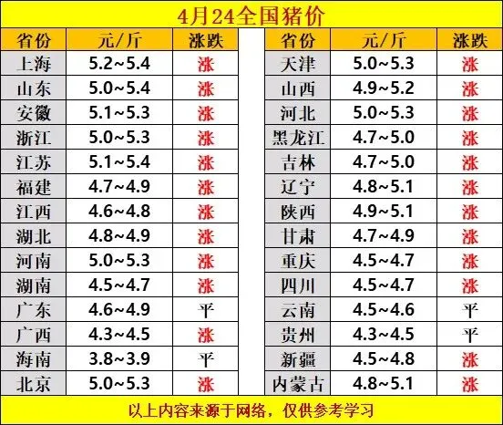 2026.4.24.——明日猪价预测 养羊网 2026-04-23 2026.4.24.——明日猪价预测 养羊网 2026-04-23 上一篇:【超前猪价】2025年4月24日-4月29日!全国猪价预测 下一篇:【4月24日】明天最新猪价!南北齐上涨! 您可能还会对下面的文章感兴趣111: 相关文章 2025年4月13日全国各地生猪价格信息 2026年3月26日 全国产区鸡蛋价格稳定为主,局部震荡调整! 2025年4月13日全国各地生猪价格信息 广州永庆坊city walk