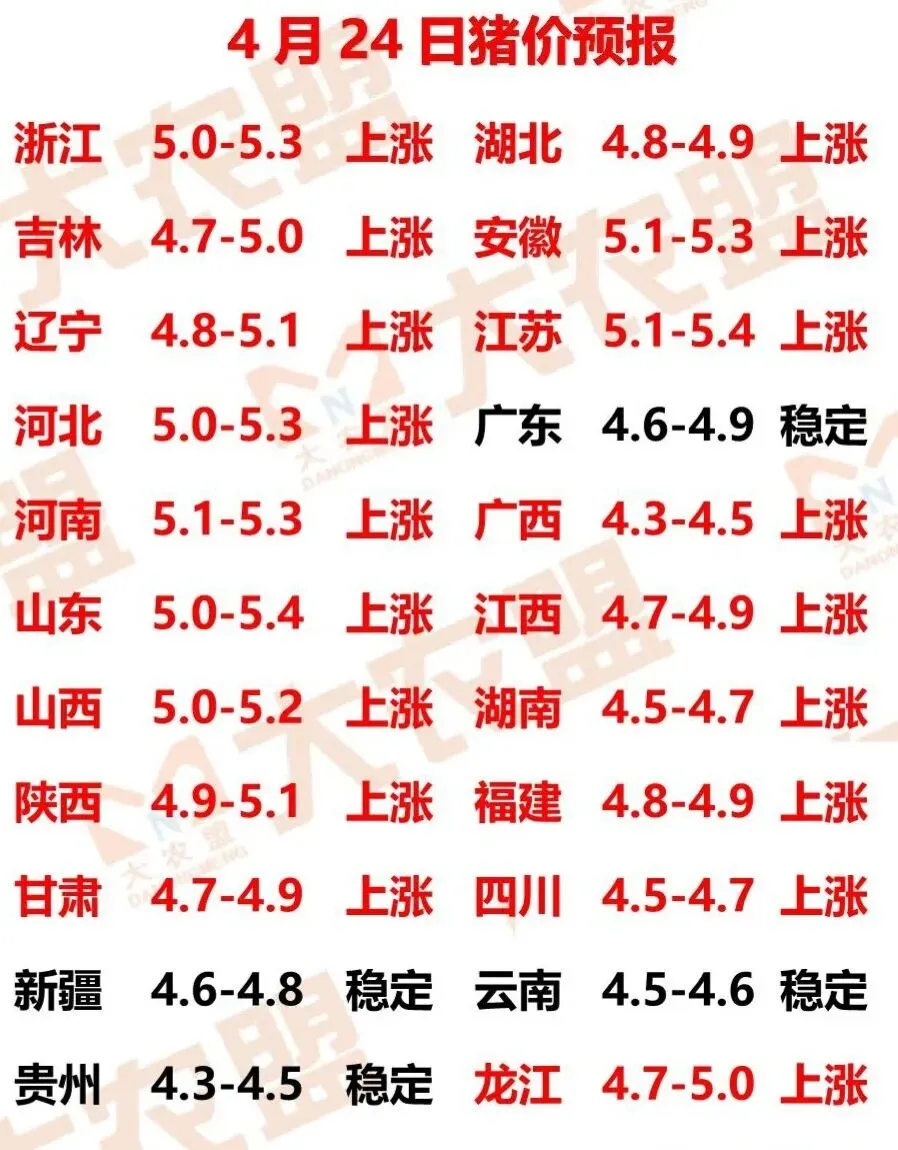2026.04.24全国猪价信息(猪价新一轮上涨开始!) 养羊网 2026-04-23 2026.04.24全国猪价信息(猪价新一轮上涨开始!) 养羊网 2026-04-23 上一篇:速看!4月24日猪价预测. 下一篇:2026-04-23 全国猪价参考 您可能还会对下面的文章感兴趣111: 相关文章 近期价格更新!!! 【全国鸡蛋价格1月28日】红蛋粉蛋再次上涨 2026初,这些地区鸡蛋价格涨到这个数,真让人意外,多地差异明显 猪价连跌后北方率先企稳?散户惜售、压价失败,今日释放关键信号
