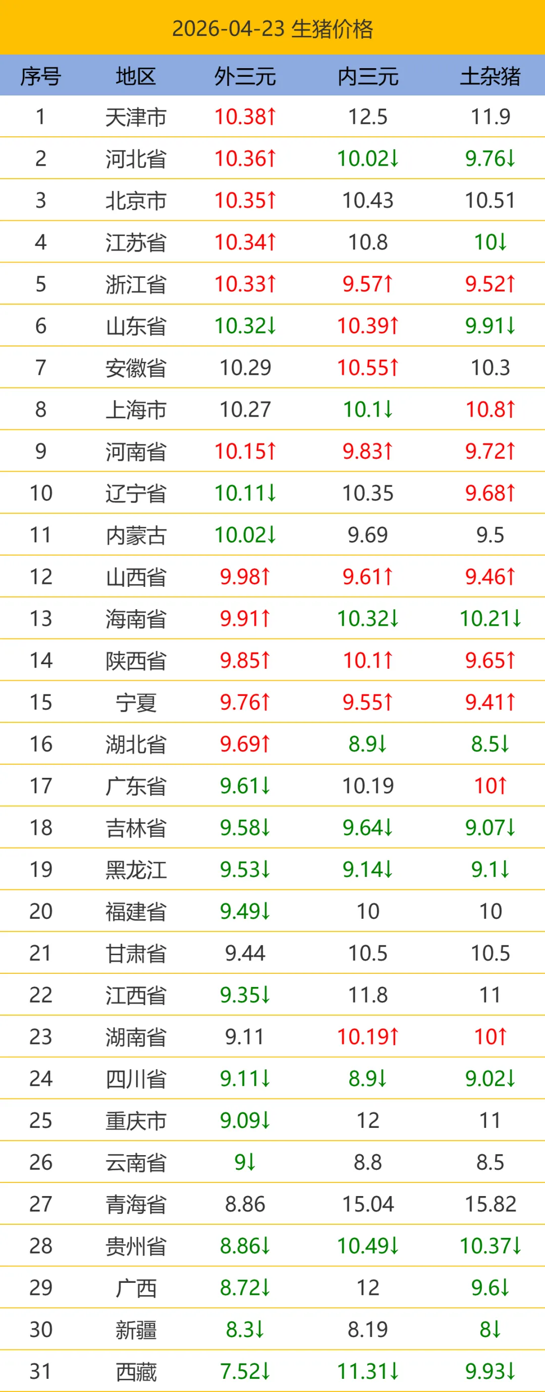 今日猪价.2026.04.23最新生猪价格/期货猪价 养羊网 2026-04-23 今日猪价.2026.04.23最新生猪价格/期货猪价以下猪价为平均价格(单位:元/公斤),仅供参考。 养羊网 2026-04-23 上一篇:猪价暴涨!31省全线飘红,多地重回10元时代,养殖户终于熬出头了! 下一篇:4月24日猪价(已更新!) 您可能还会对下面的文章感兴趣111: 相关文章 第一年卖家里羊肚菌这种品质65一斤贵吗? 2025年4月13日全国各地生猪价格信息 全国猪价(2.27) ?妖娆版-赛博秧歌来啦~