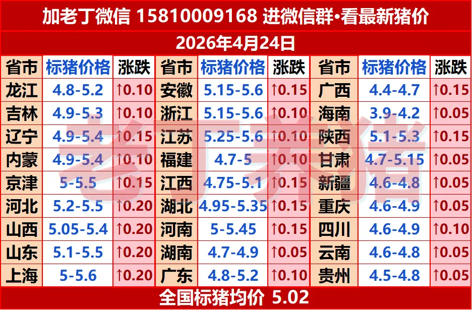 猪价大涨!【明天猪价】4月24日全国最新猪价涨跌表! 养羊网 2026-04-24 猪价大涨!【明天猪价】4月24日全国最新猪价涨跌表! 养羊网 2026-04-24 上一篇:猪价继续跌,又迎来3个重大消息,养殖户全线亏损还有救吗? 下一篇:猪价跌穿十年新低,猪企为何越亏越养?三大残酷真相! 您可能还会对下面的文章感兴趣111: 相关文章 在养殖基地的桃花羊,卖羊肉我是认真的 唐山疫情第九天,鸡蛋自由啦! 合牧远纽泰壮|养牛养羊不踩坑,去油增肌稳增收,解锁养殖盈利新密码 近期价格更新!!!